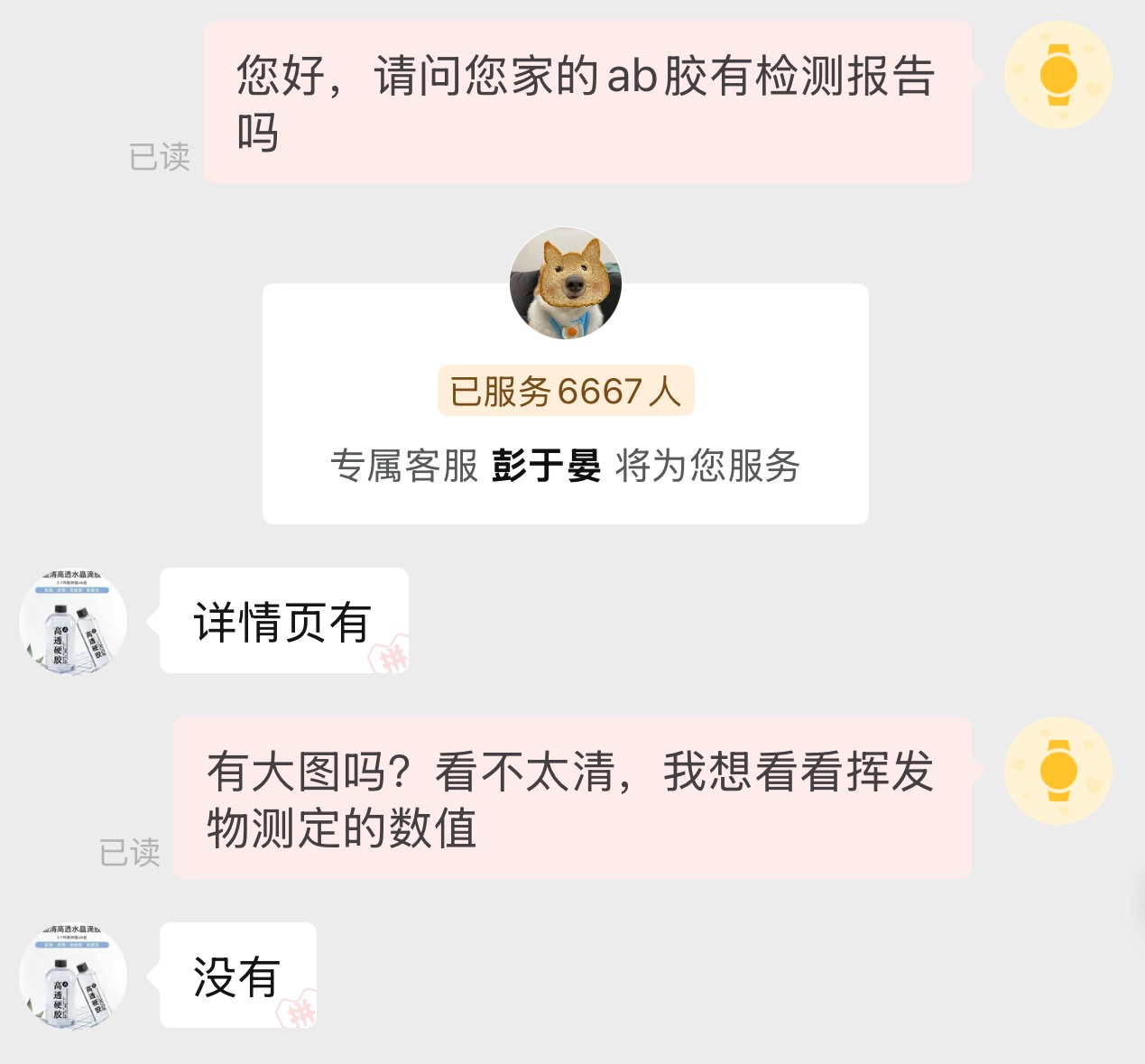 记者向售卖滴胶材料的商家询问,是否能提供检测报告,有的商家直接回复“没有”。还有的产品,明明在宣传页中有检测报告的缩略图,只是内容看不清楚,但当记者向客服询问能否提供报告原图时,对方却说无法提供。