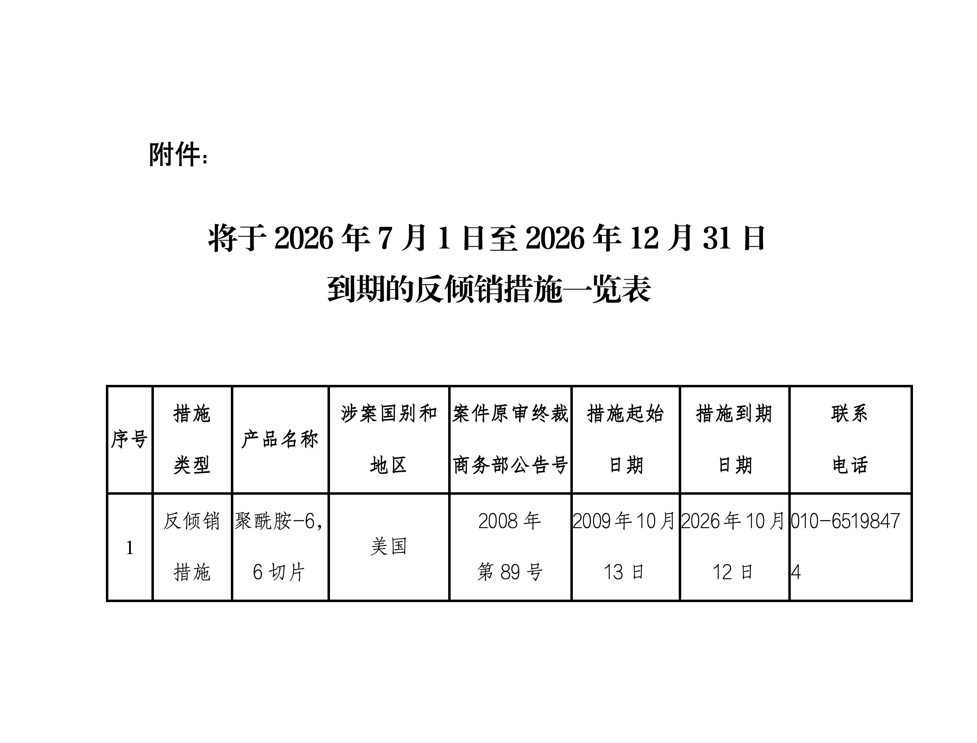 一、将于2026年7月1日至2026年12月31日到期的反倾销措施通过本通知一并对外告知(见附件),商务部贸易救济调查局不再发布个案措施到期通知。