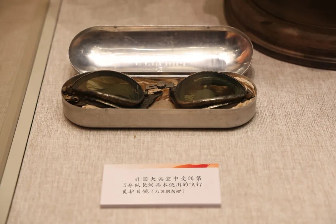 开国大典空中受阅编队领航机长刘善本使用过的飞行护目镜,征集过程可谓是由遗憾到惊喜的完美蜕变。在最初的征集中,刘善本之孙刘笑鹏向我馆捐赠了刘善本使用过的飞行护目镜收纳盒,由于年代久远,收纳盒内的护目镜已不知所踪,当时作为征集人员还是略感遗憾。然而命运的齿轮终究还是在悄悄转动,未尽的缘分终究不会消散。距上一次捐赠数月之后,捐赠人在整理物品时意外发现了一副飞行护目镜,当时就有一种感觉,曾经的遗憾将在此时回归圆满。在经过一些系列的细节比对和试放之后,证明两者确属完整一套,刘善本之孙刘笑鹏当即表示一并捐赠给香山革命纪念馆,成就了展览中此件藏品的珠联璧合。