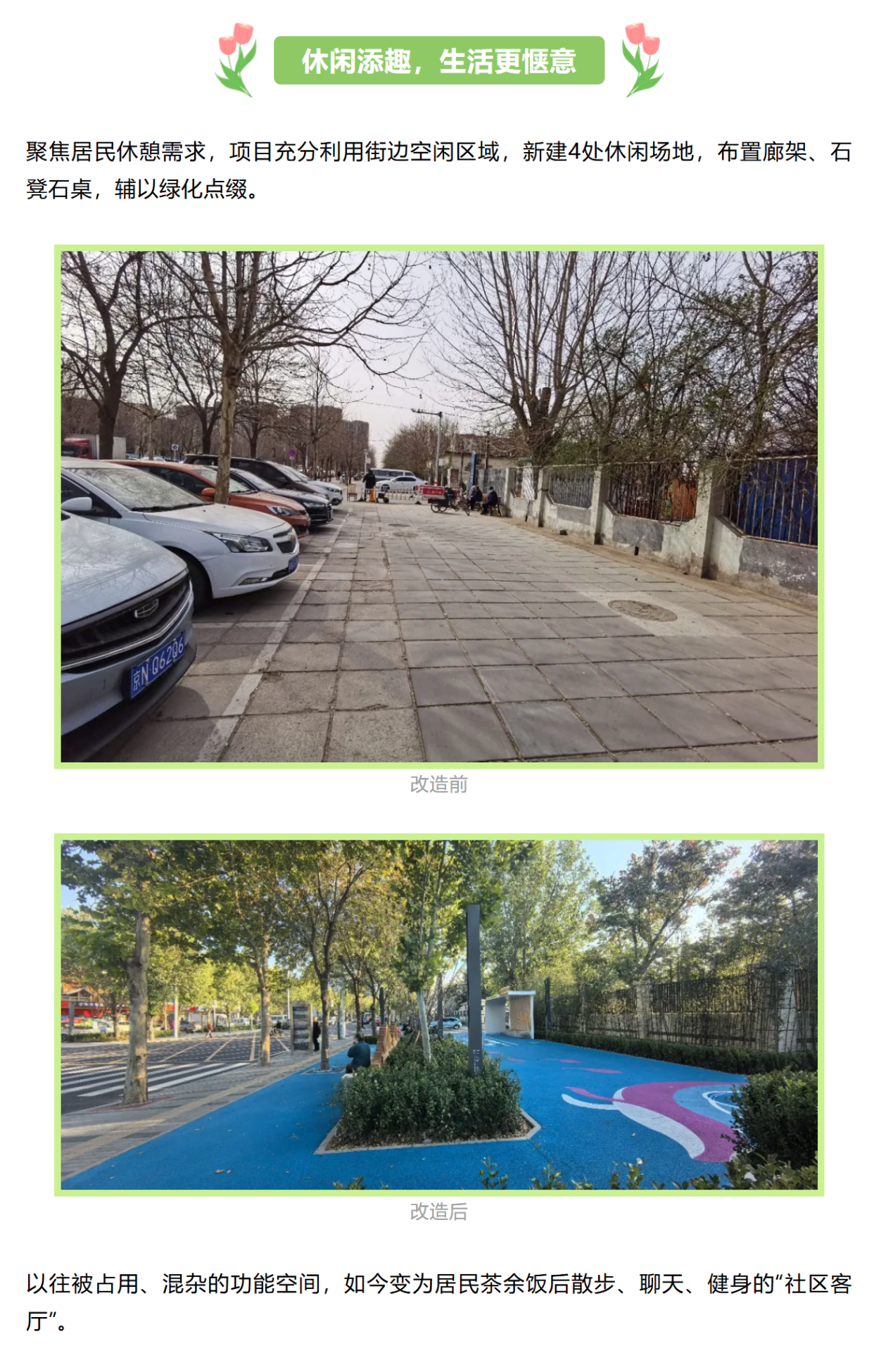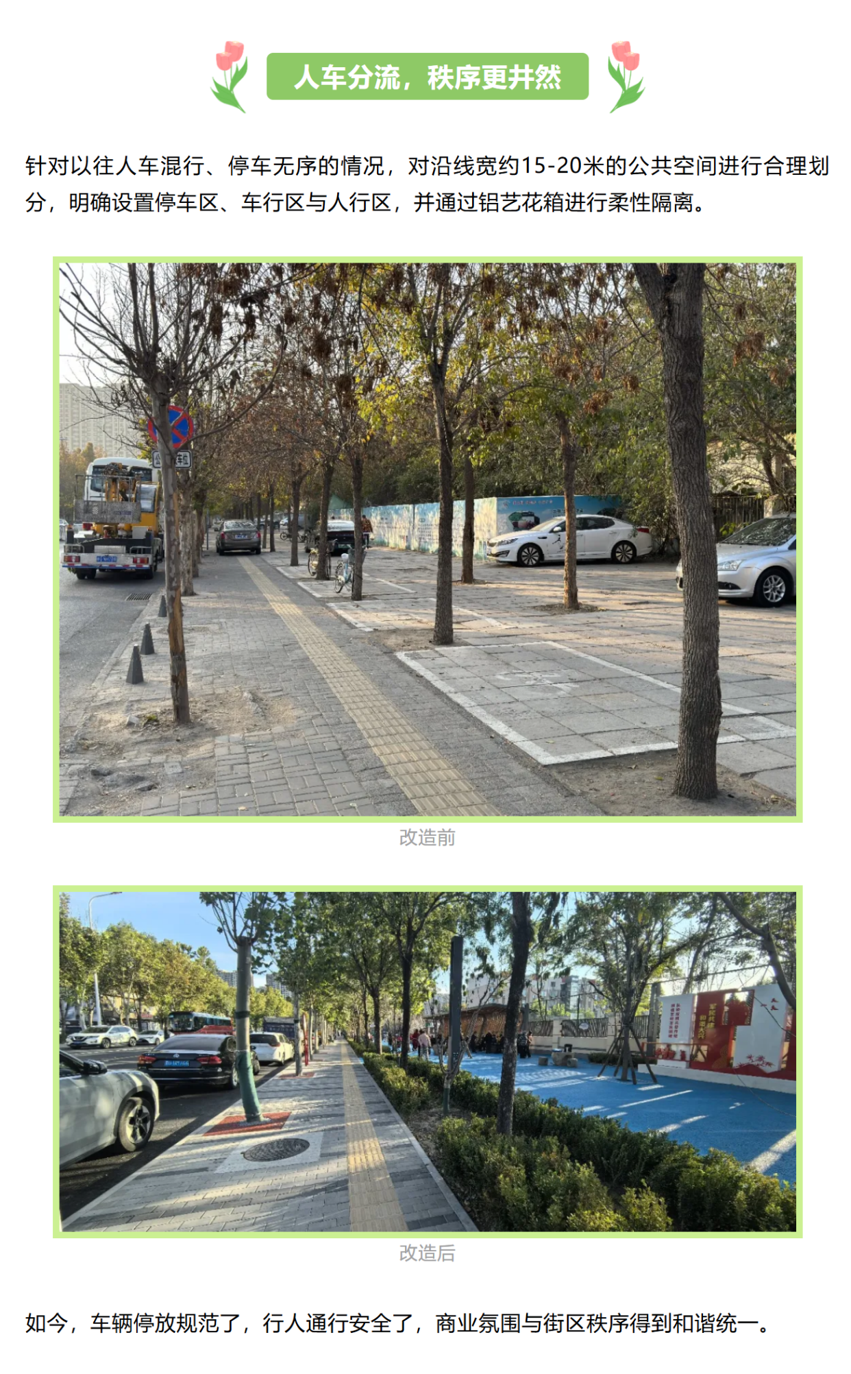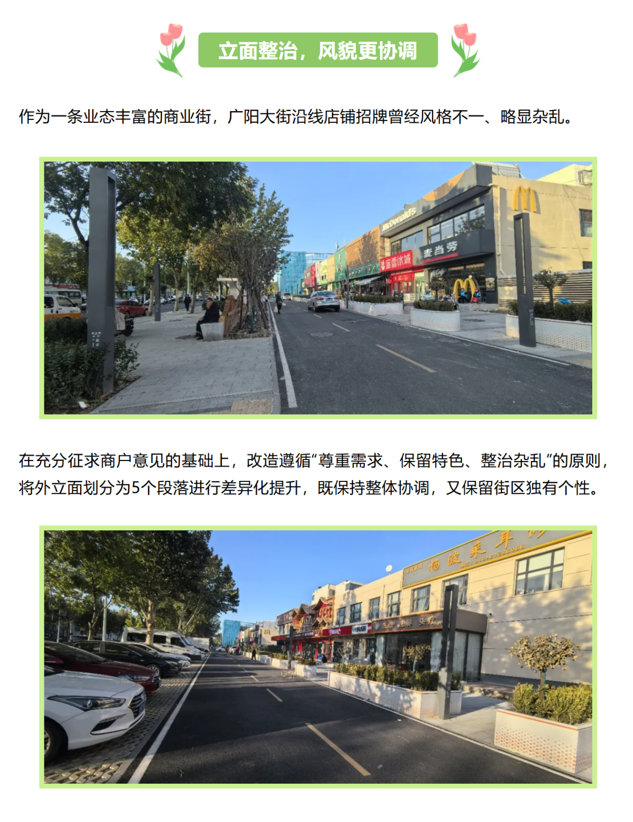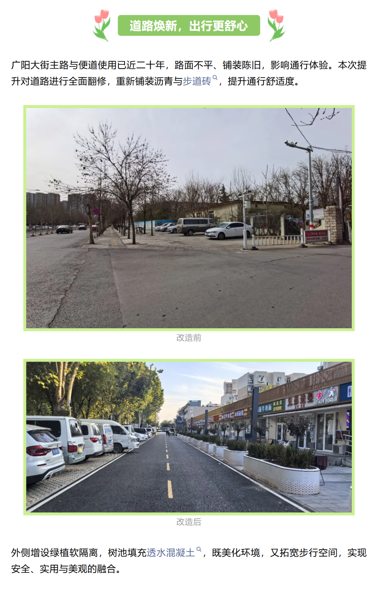 如今,漫步广阳大街道路平坦整洁,人车分流有序,休憩空间处处可见街,一次提升不仅改变了街区的面貌,更温暖了居民的生活。