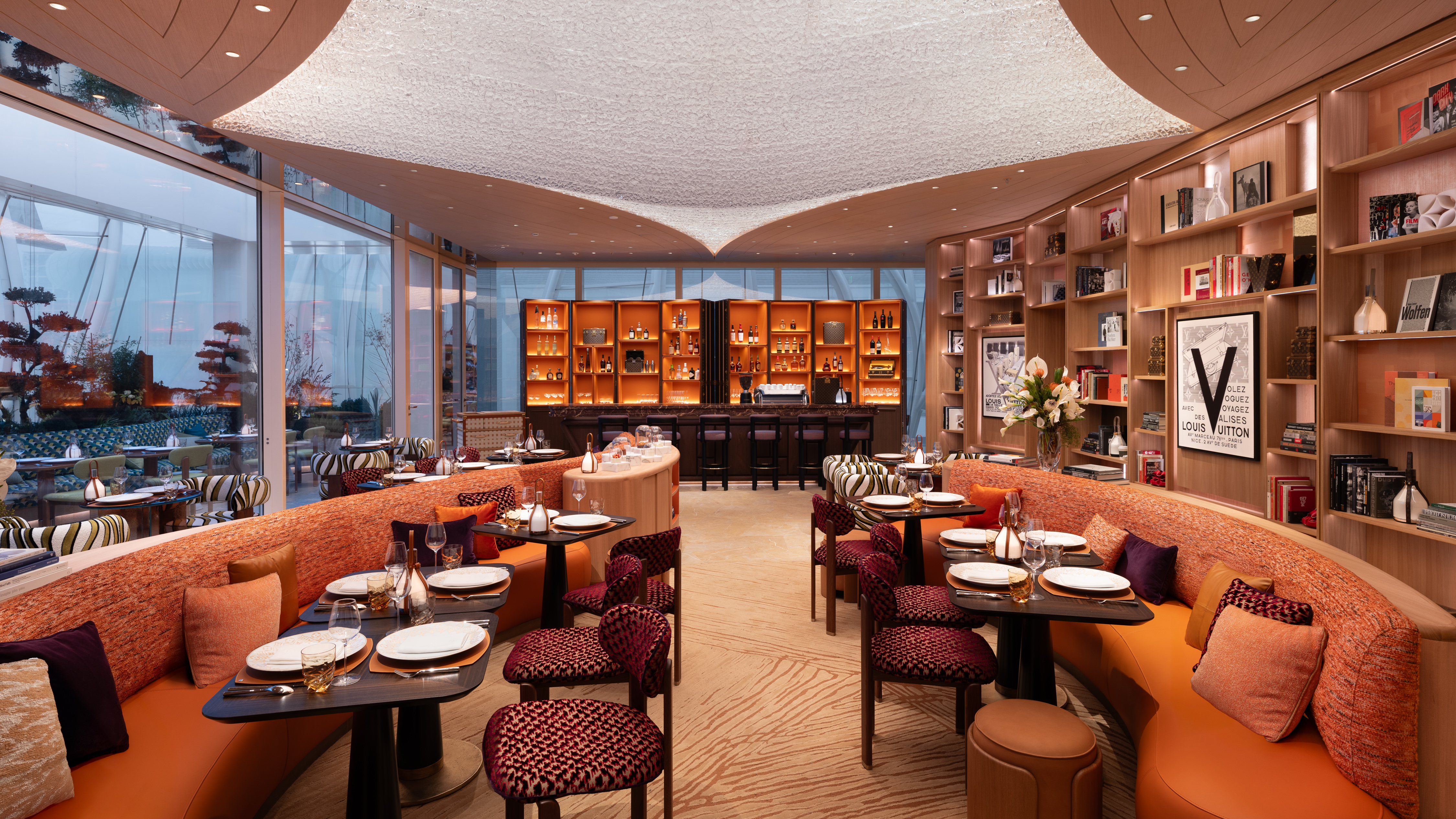 得到路易威登经典硬箱的启发,吧台区域旨在致敬路易威登的精湛工艺。餐区露台则沿建筑立面延伸,彰显着青木淳的设计理念,开放迎接着城市律动,为客人提供一处兼具雅趣与活力的静谧休憩之所。