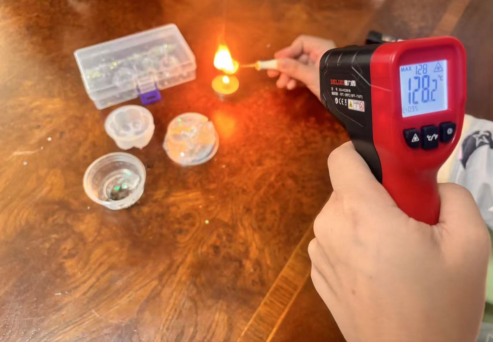 这些玩具实际温度有多高?记者在东城区一家文具店购入一款“DIY猫爪捏捏乐”进行实测。按照说明,孩子需点燃蜡烛,用金属勺熔化果冻蜡后倒入模具。红外测温仪显示,加热过程中金属勺表面温度达128.2摄氏度,果冻蜡遇热熔化后包裹着金属勺迅速燃起浓浓黑烟,并变成明火燃烧,这足以造成孩子皮肤烫伤。