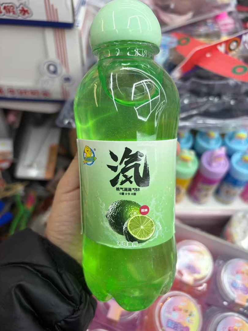 存在类似风险的还有“假水”玩具。这种外观像纯净水或果汁的起泡胶,常被冠以“芒果汁”“羽衣甘蓝纤体瓶”等名称出售。记者在百荣世贸商城看到,一款名为“桃气满满气泡水”的产品,瓶身上甚至印着“0糖、0卡、0脂”字样,与真饮料极其相似。“做得像吧?现在孩子就喜欢这种。”一名玩具批发商对记者说道。
