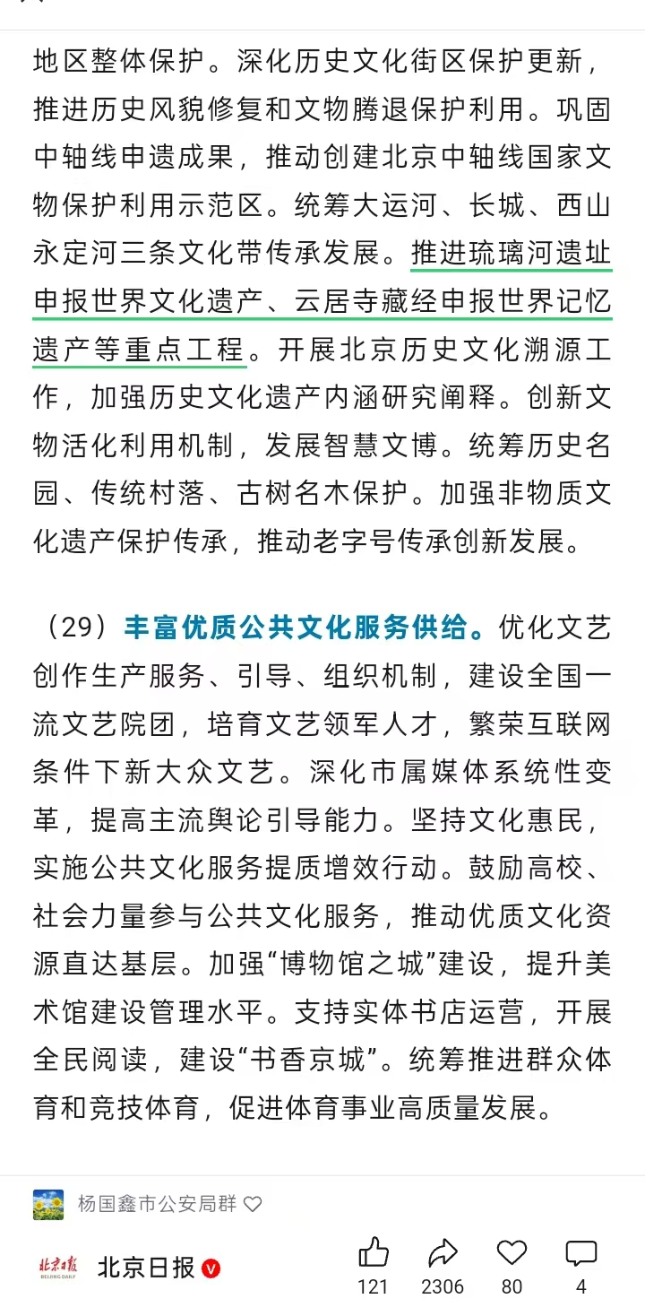 会议指出:要加强历史文化保护传承,“推进琉璃河遗址申报世界文化遗产、云居寺藏经申报世界记忆遗产等重点工程”。