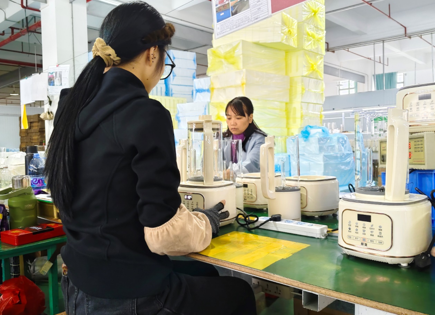为保障产品质量,工人在破壁机打包发货前对各项功能稳定性进行再次检测。曾邵|摄