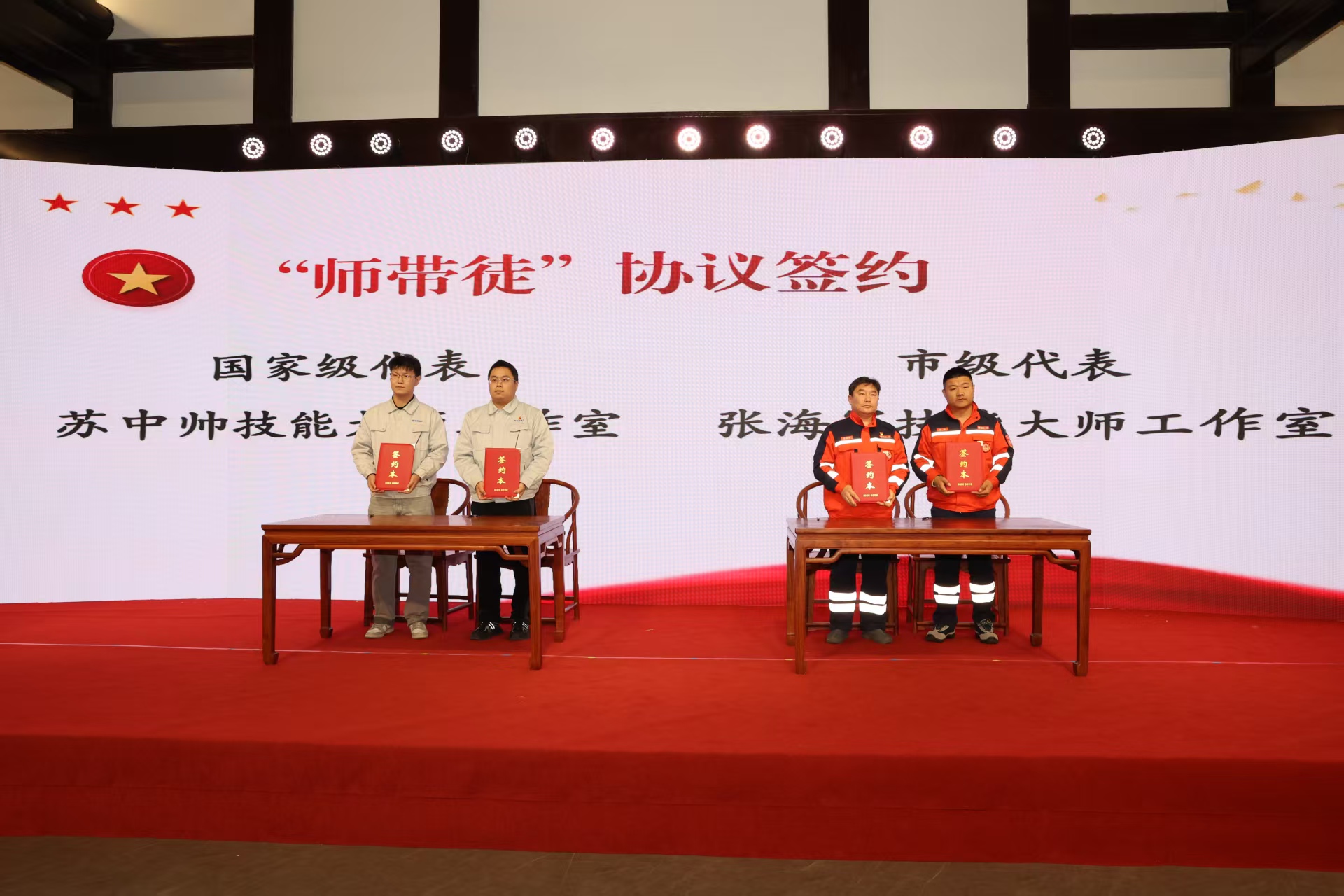 活动现场还开展了技能大师工作室建设目标任务责任书、合作意向书和“师带徒”协议签订,明确工作室建设方向与任务目标、促进交流合作与资源共享、做好技艺传承与匠心接力。随后,技能大师的徒弟们向师傅敬献鲜花,表达对师傅悉心教导的深深敬意。