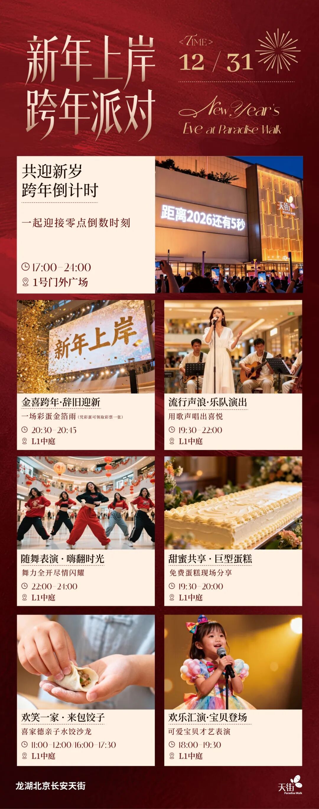 从早到晚不打烊!白天带娃一起包饺子、品年味,看萌娃年末汇演;夜晚活力乐队、随机舞蹈表演点燃现场,还有惊喜彩蛋金箔雨、户外墙体投影倒计时,带你沉浸式倒数迎接新年!