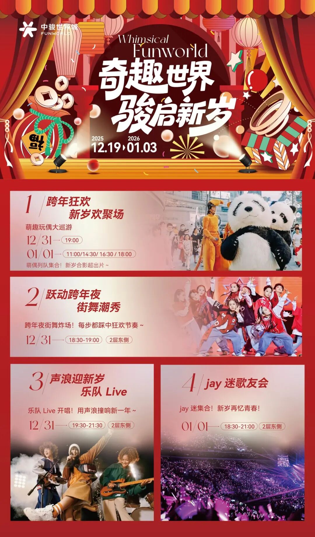 中骏世界城萌趣玩偶大巡游超好拍,跨年街舞炸场每步都踩中狂欢节奏,乐队live开唱用声浪撞响新一年。敲重点!Jay迷歌友会来啦!1月1日经典歌曲大合唱,快来和同好一起重温青春回忆杀~