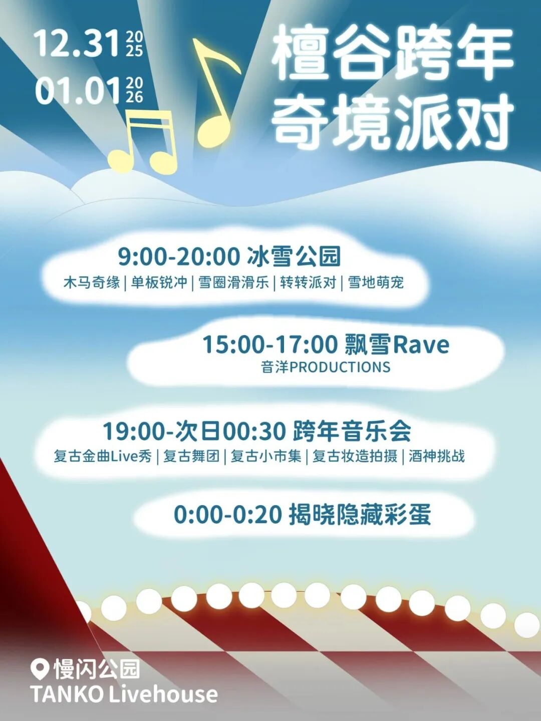 全北京独一份儿!2025年最后一天来檀谷,在雪国游乐场玩雪圈、滑单板,丢掉KPI,做回撒野的小孩儿。在漫天飞雪中,与音洋PRODUCTIONS雪地蹦迪,体验北京首个雪地里的飘雪锐舞。和粉红色大象、热斑等乐队一同唱响经典旋律,重回黄金年代。在檀谷照相馆get免费妆造+拍立得,定格跨年瞬间!零点过后先别走,还有神秘隐藏彩蛋!