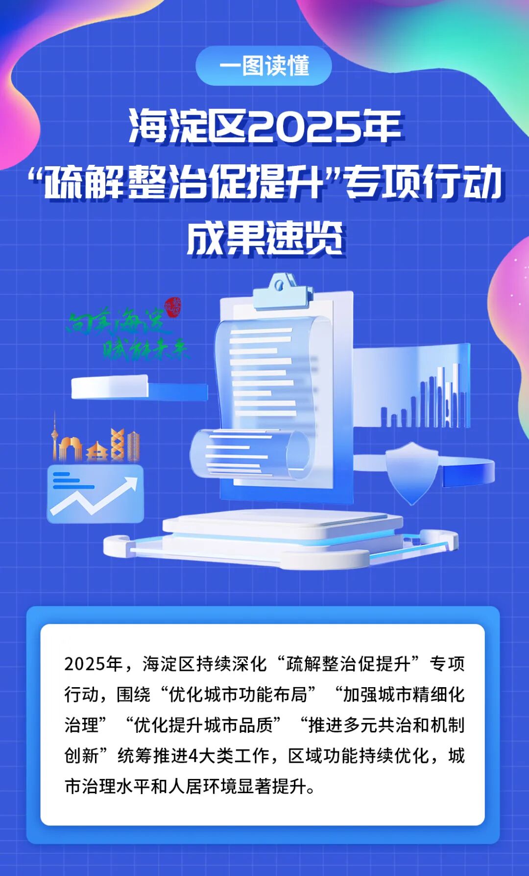 “2025年,海淀区持续深化‘疏解整治促提升’专项行动,围绕‘优化城市功能布局’‘加强城市精细化治理’‘优化提升城市品质’‘推进多元共治和机制创新’统筹推进4大类工作,区域功能持续优化,城市治理水平和人居环境显著提升。”区发改委相关工作人员介绍。