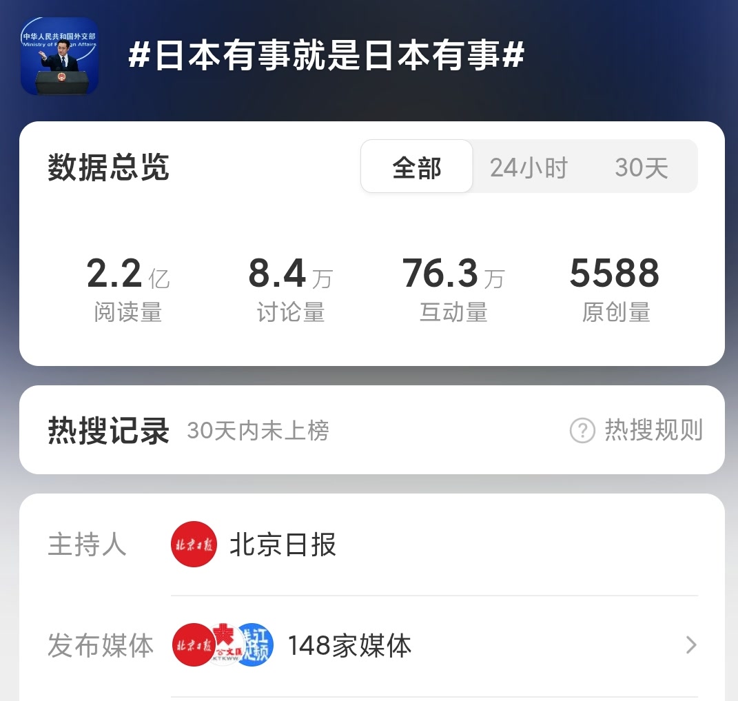对此,“长安观察”犀利点评“日本有事就是日本有事”,简单直白的标题深得人心,话题迅速冲上热搜第一。