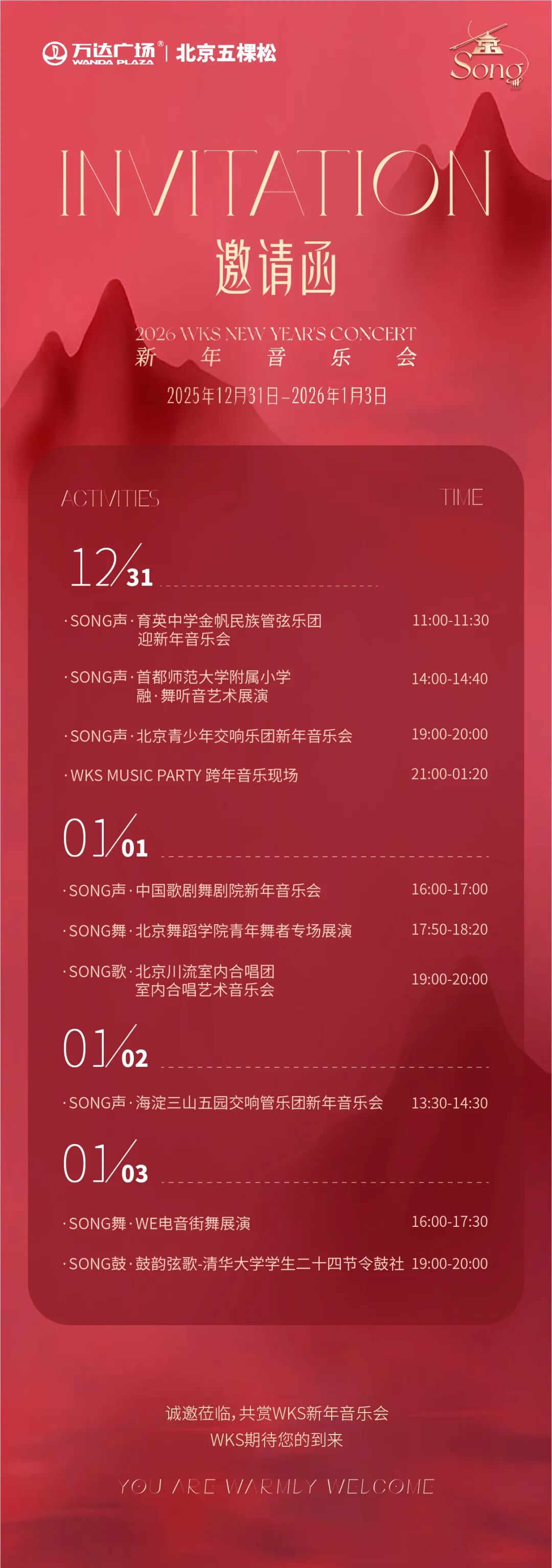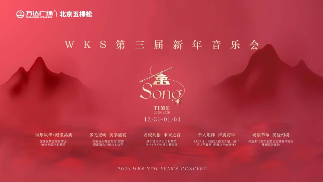2025年12月31日至2026年1月3日,北京五棵松万达广场以“宋·松·SONG”三重寓意为核心,融合宋代风雅美学、五棵松地域情感与音乐盛典形式,打造“跨年新主场,西边听我的”可感知的“场景内容”。