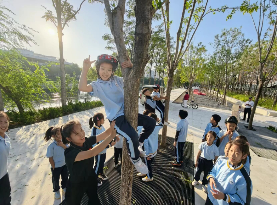课堂形态上,它打破了学科与校园的围墙。例如,在北京十一学校丰台小学,学生们成为2000平方米闲置绿地的设计者,他们将数学、科学、艺术知识融于一体,亲手规划出观鸟台与四季迷宫,学习变为了主动创造。在丰台外国语学校,体育课在凉水河畔被重新定义,爬树课程让孩子们在锻炼体魄的同时,更习得了与自然相处的勇气。