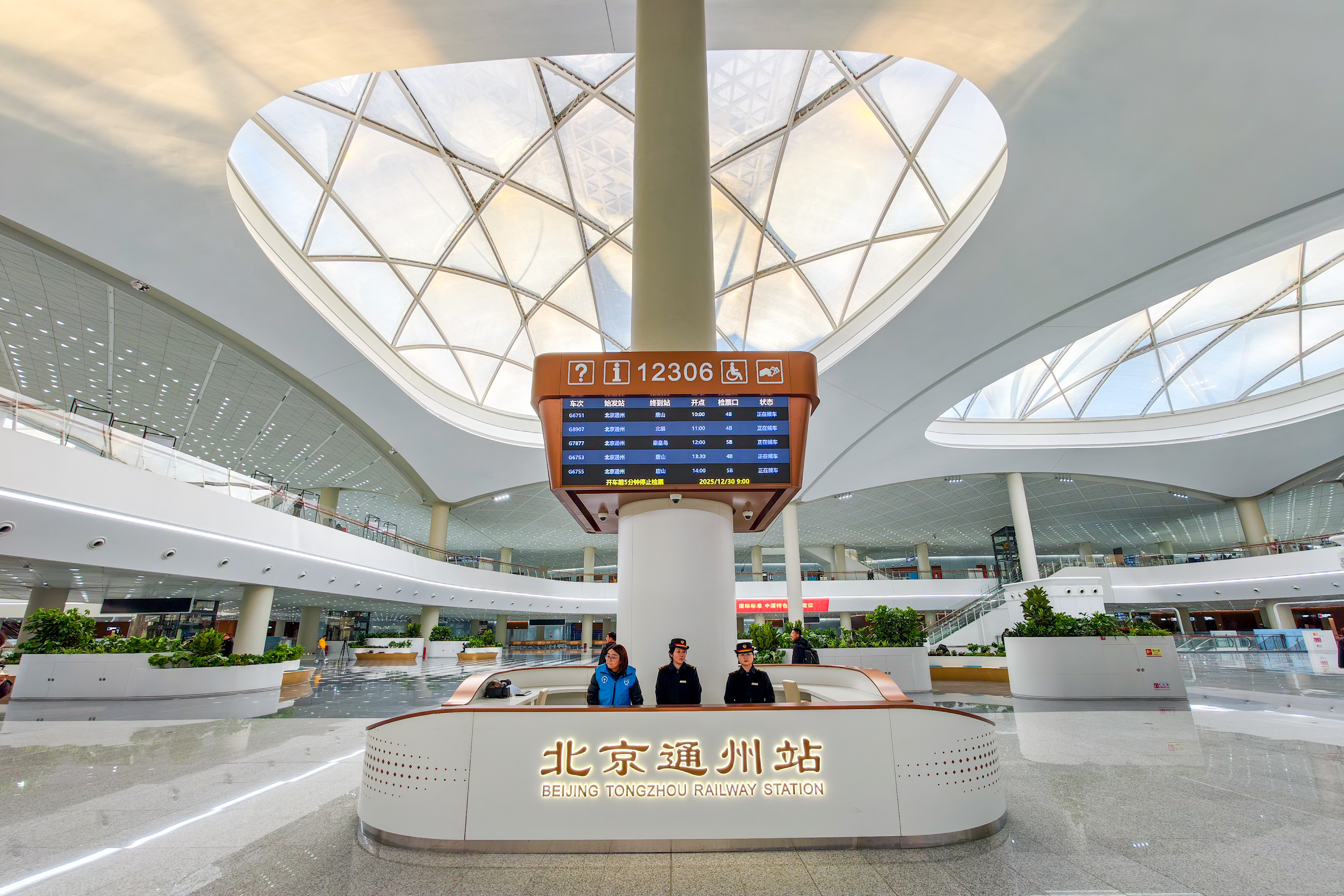 12月30日,坐落于北京城市副中心综合交通枢纽(简称副中心枢纽)内的北京通州站正式开通投运,北京“八站两场”综合交通枢纽格局成型。今天上午10时,首趟列车载着448名旅客从北京通州站发出,终点为唐山,全程1小时整。