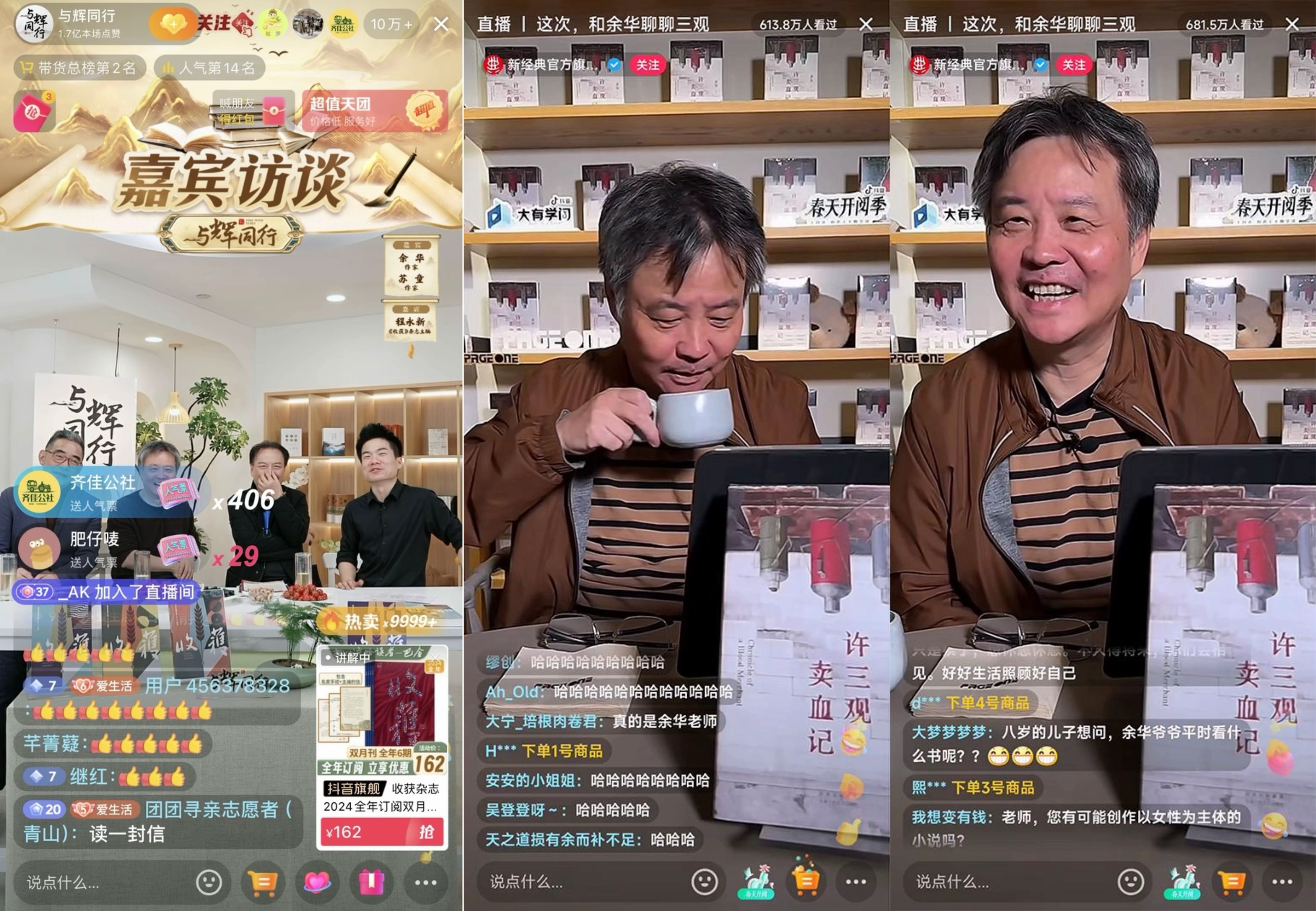 同时,余华也多次通过抖音电商直播间与网友畅聊文学、阅读与思考,带动经典图书与杂志热销。2023年9月,余华携多部经典作品与主播董宇辉就“生活在时间里”这一主题展开对谈;2024年2月,余华、苏童、《收获》杂志主编程永新与董宇辉面对面,畅聊文学和写作,带动老牌文学杂志《收获》热销8.2万套;4月,余华在抖音开启首场单人直播,在线回答网友提问,和网友聊“三观”,吸引超过682万网友在线观看,售出《许三观卖血记》《第七天》《活着》等系列书籍近1.2万册。