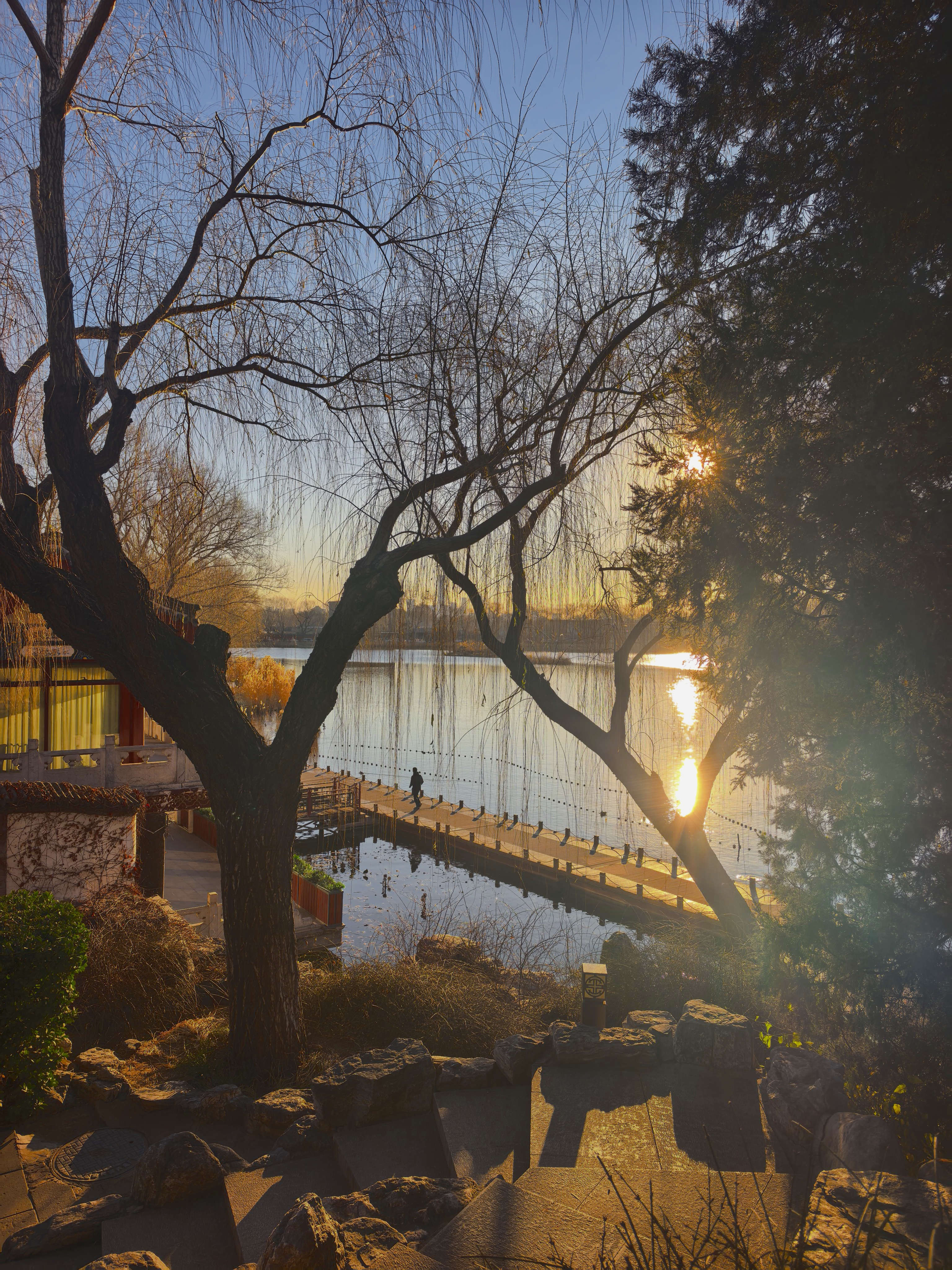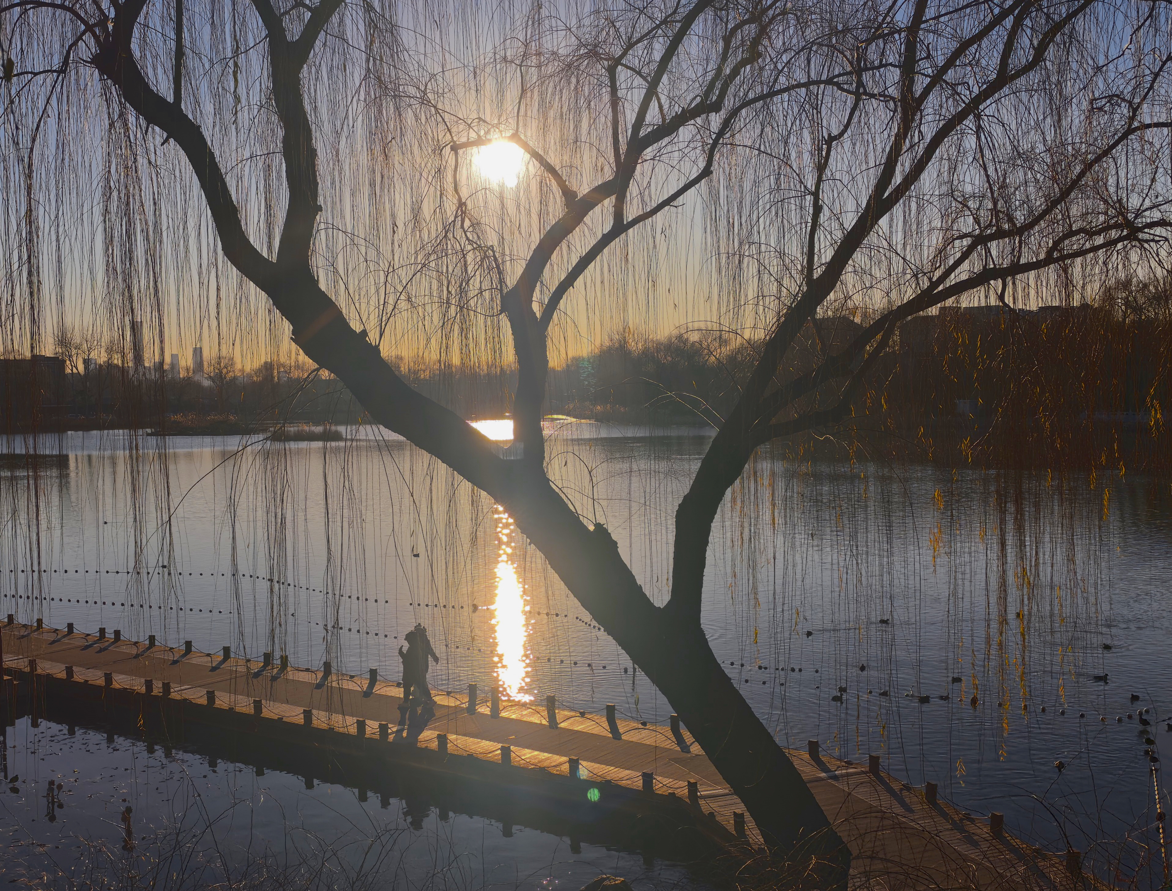 12月30日,北京西海湿地公园。游人在公园里悠闲散步,水鸟在水中自在游弋,一片生机勃勃。