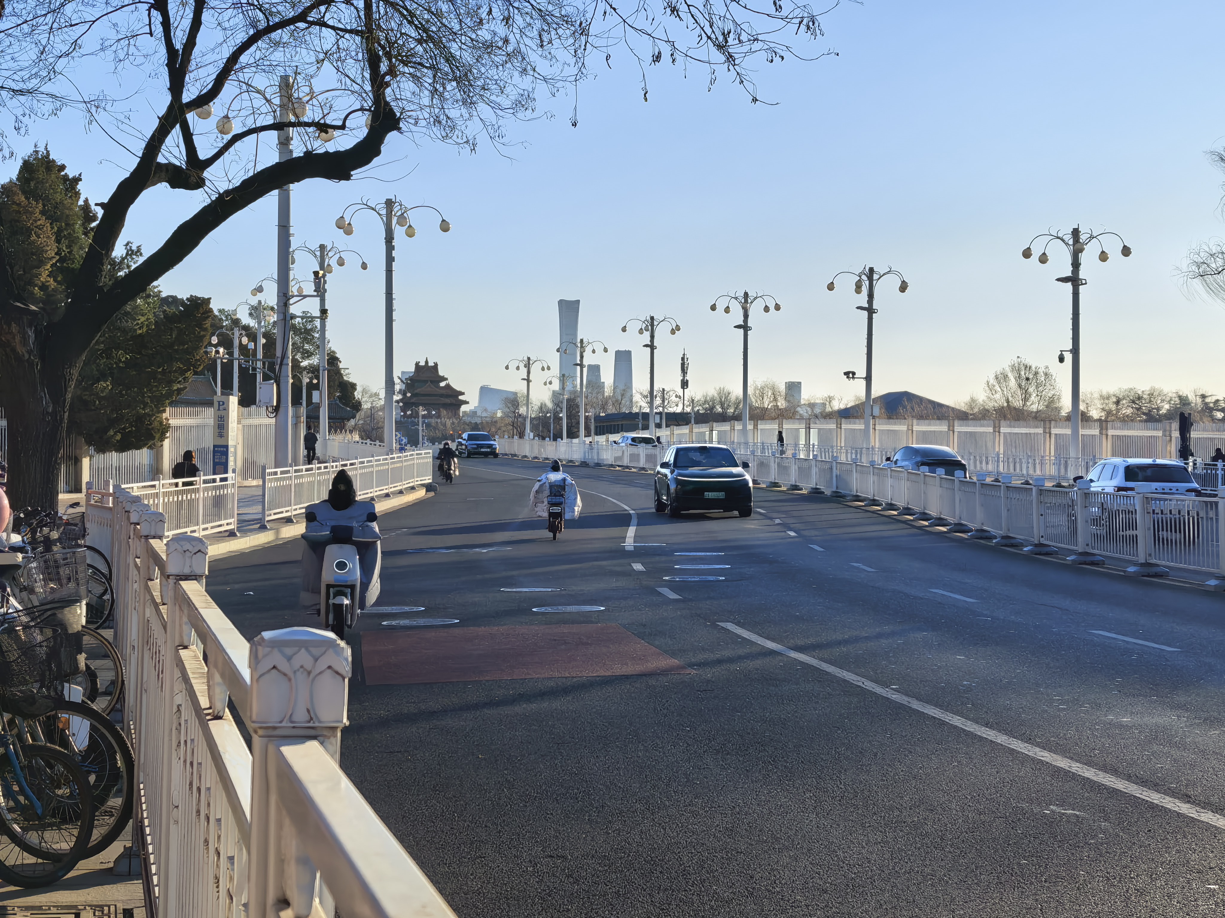 这时太阳已升得较高,光的角度改变,整条街道进入新的光影章节。古籍馆的青砖墙现在完全笼罩在光中,砖雕的莲花仿佛随时会绽放;角楼的斗拱投下更短的阴影,建筑的立体感达到极致;北海的水面金光粼粼,每一片波光都是一面小镜子,反射着天空与建筑;景山上的亭台轮廓清晰,青松翠柏的颜色在强光下饱和如翡翠。