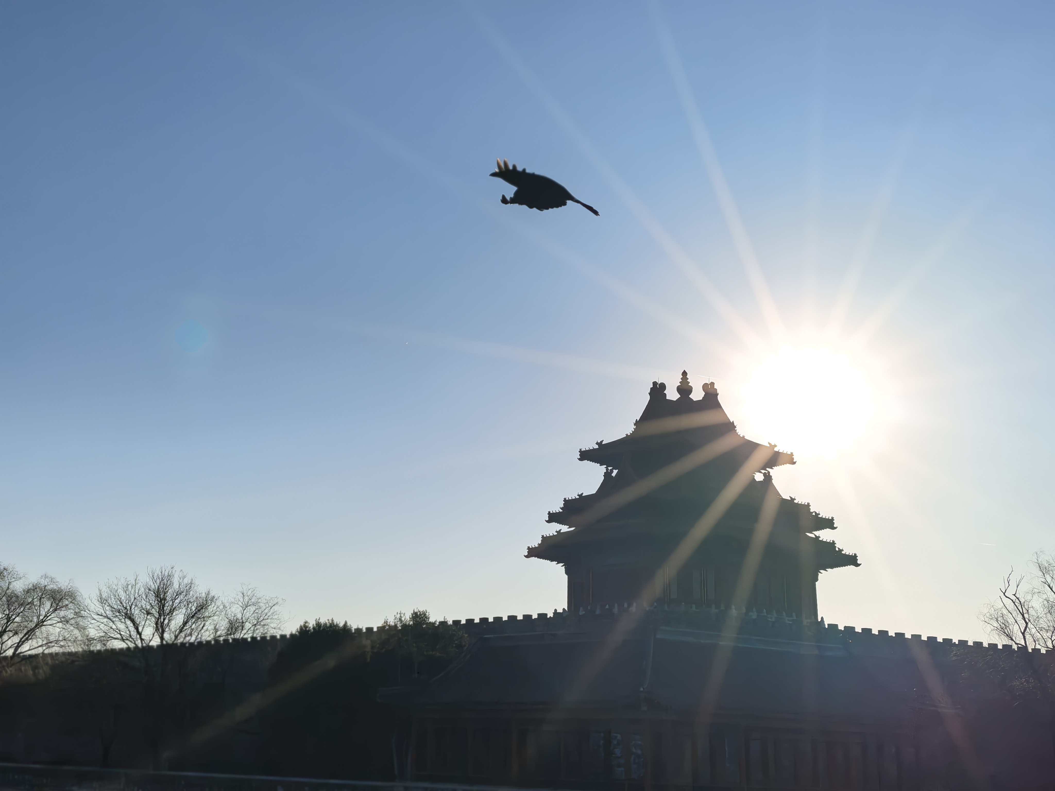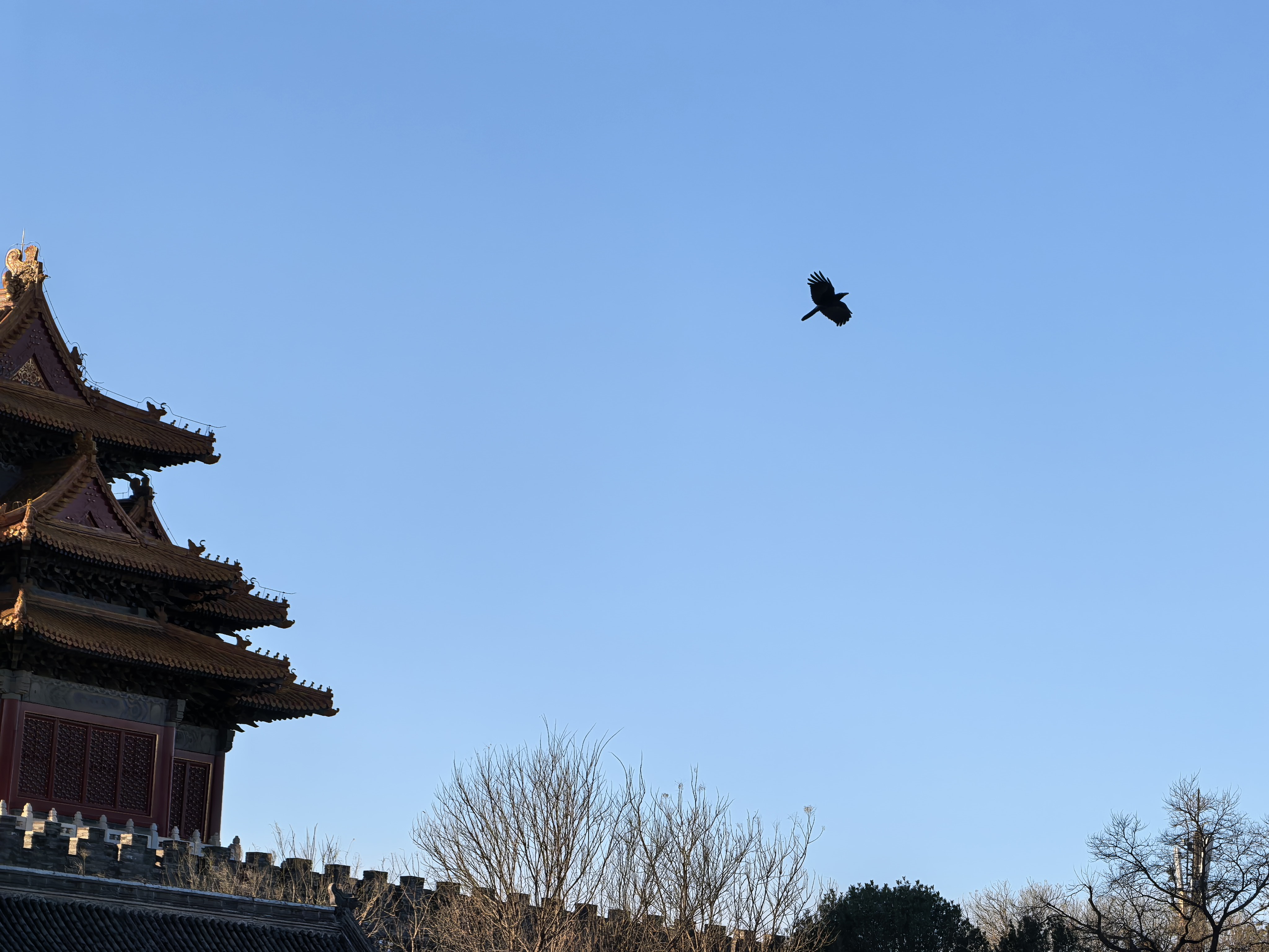 一群寒鸦从角楼后方飞起,翅膀拍打的声音在清冷的空气中格外清脆。它们绕楼三匝,黑色的身影掠过金色的屋顶,在蓝天上划出短暂的墨迹,随即被风吹散。这飞鸟与建筑的对话持续了六百年——鸟儿换了一代又一代,角楼却始终在那里,等待着每一个冬日的晨光。