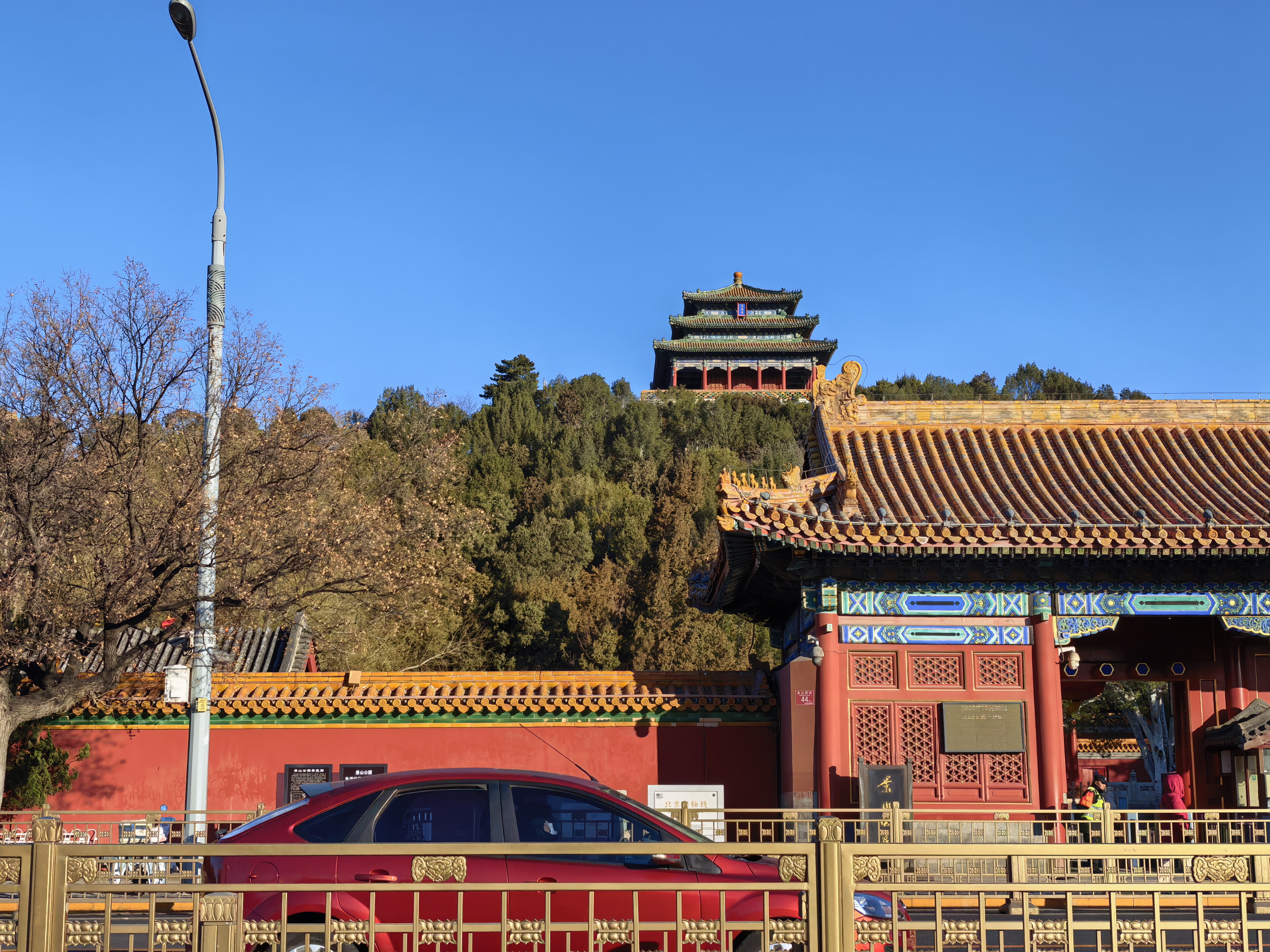 我沿街继续东行,来到景山前街。从这里可以同时看见景山与故宫的完整对话。
