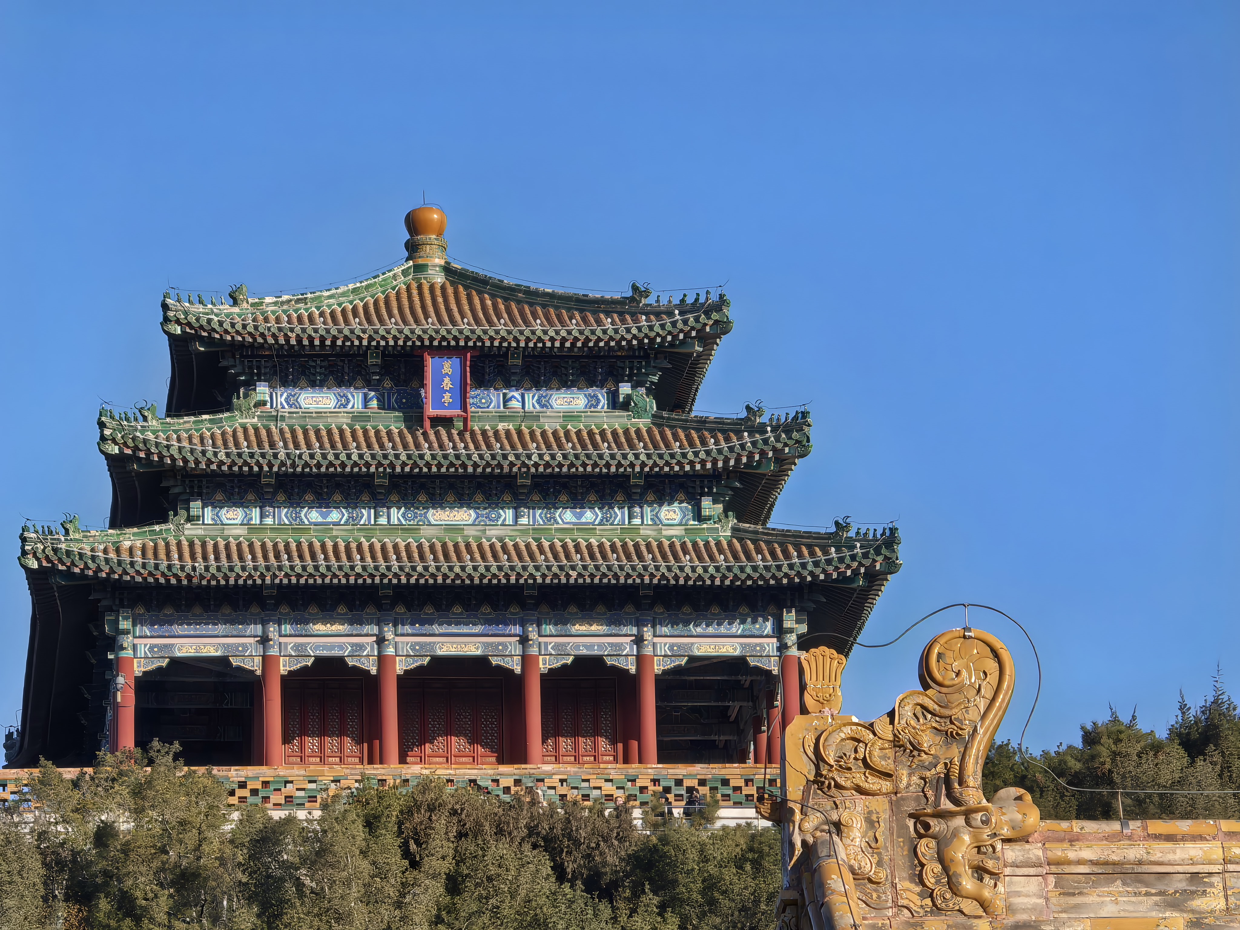 景山是温柔的守护者。它不像真正的山那样险峻,而是以圆润的曲线怀抱山下的宫殿。万春亭居于山顶正中,两侧四亭对称分布,像一位长者伸开的双臂。山上的古柏在冬日里依然苍翠,它们的影子斜斜地铺在山坡上,与亭台的影子交织成古老的图案。有些柏树的枝干虬曲如龙,那是三百年风雪的雕塑。