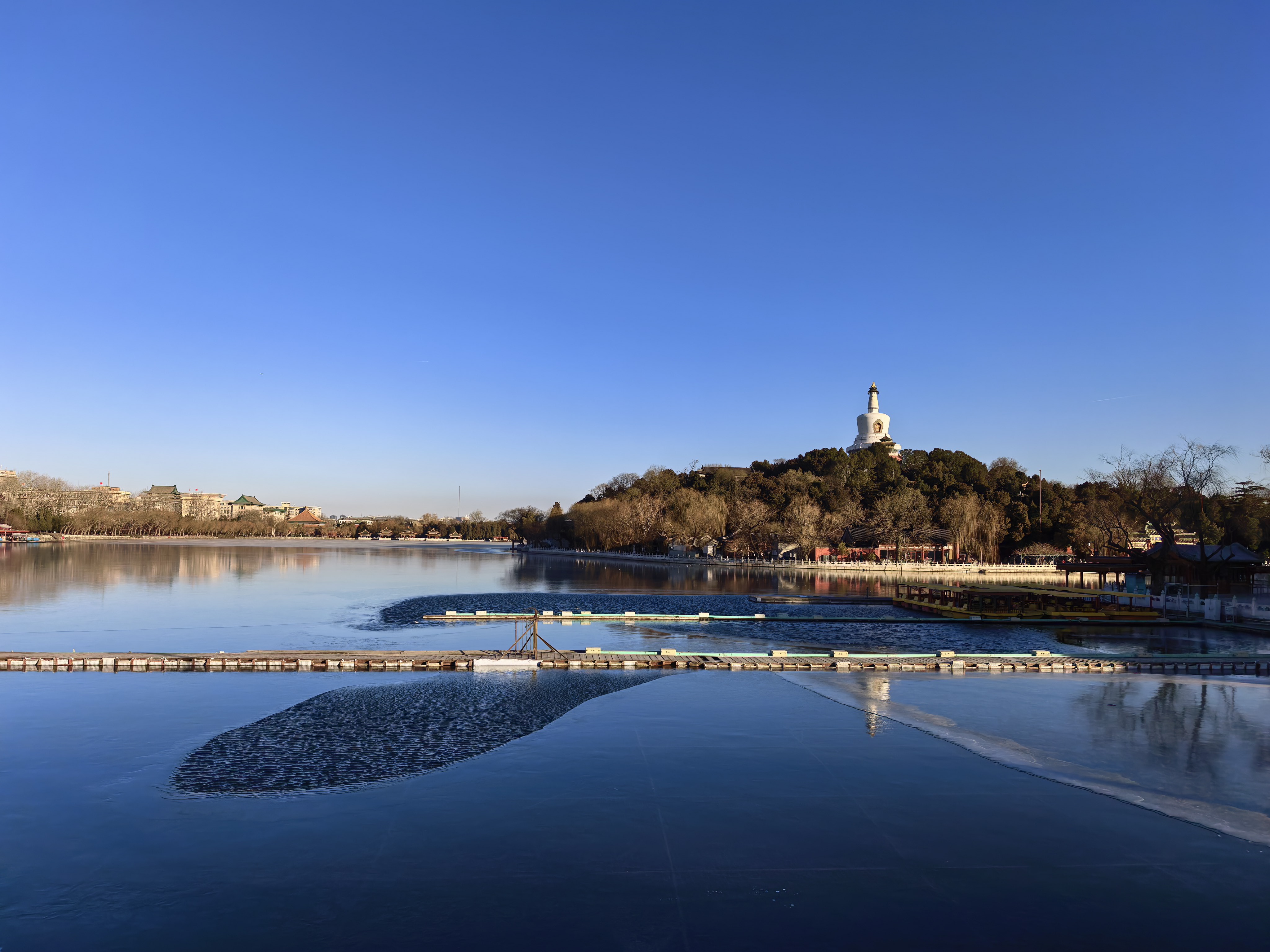 向东二百步,视野豁然开朗。北海的水面像一块巨大的、未完全凝固的琉璃,倒映着琼华岛上的白塔。那塔的影子在水中微微晃动——不是风吹水面,而是光在行走。阳光穿过稀薄的晨雾,在水面上铺出一条碎金之路,从北岸一直延伸到目光不及的远方。