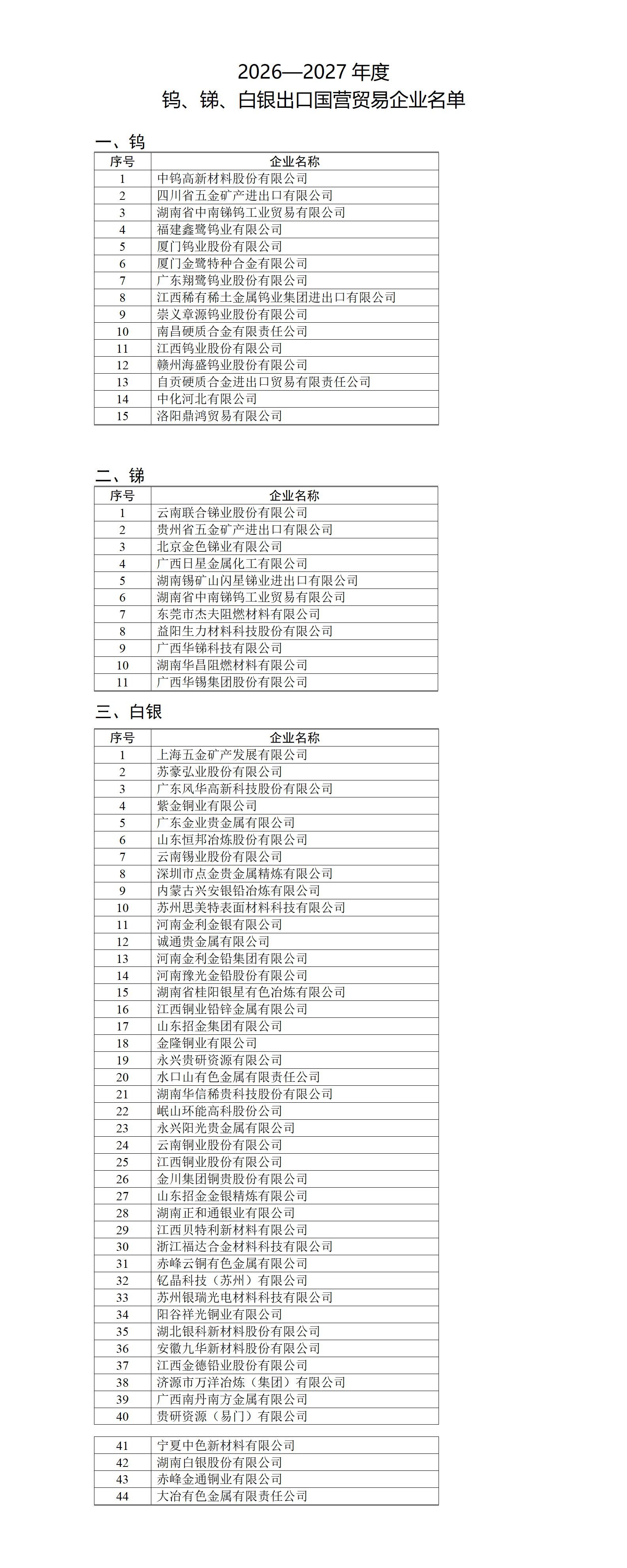 商务部公布最新钨、锑、白银出口国营贸易企业名单