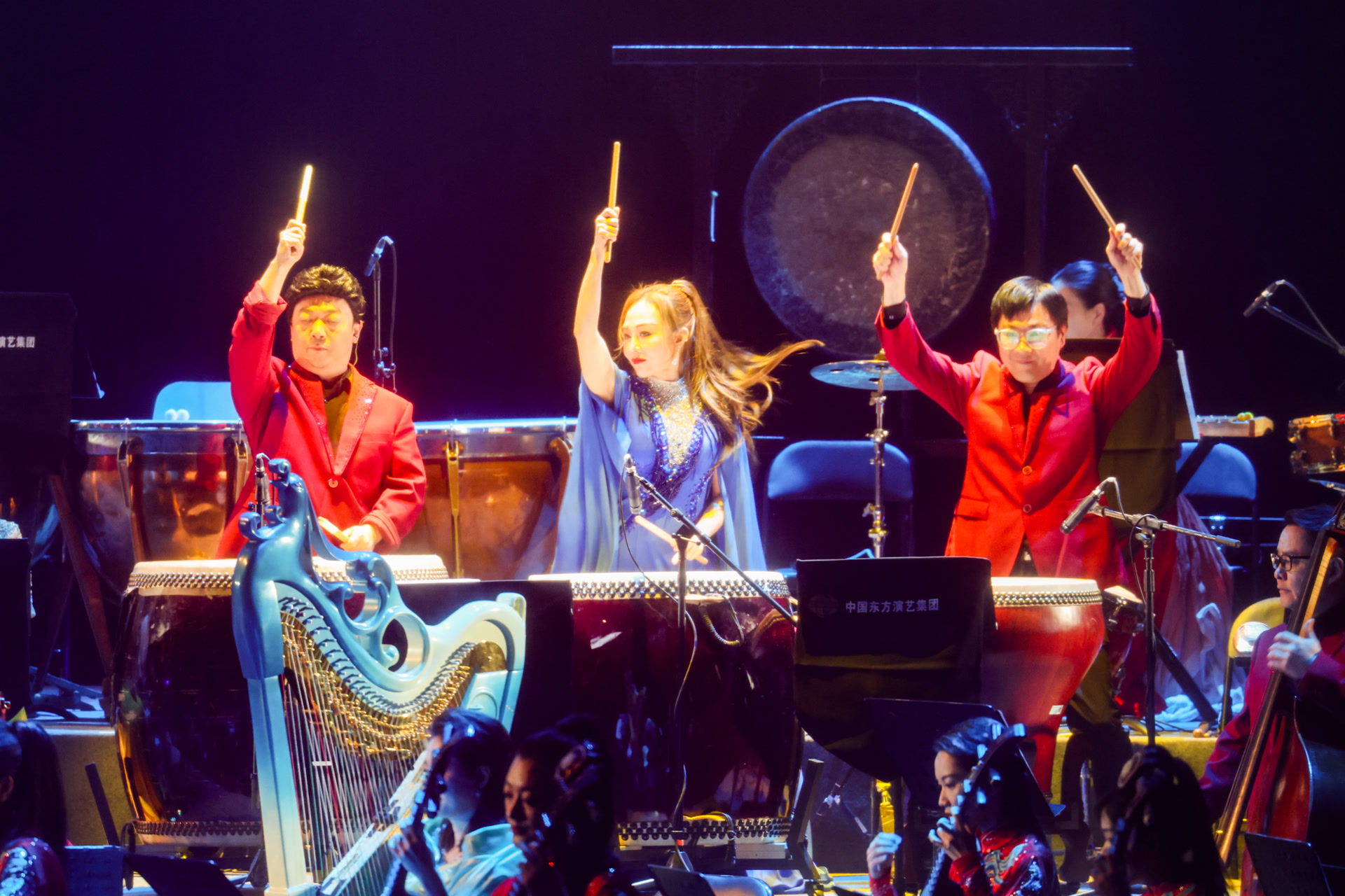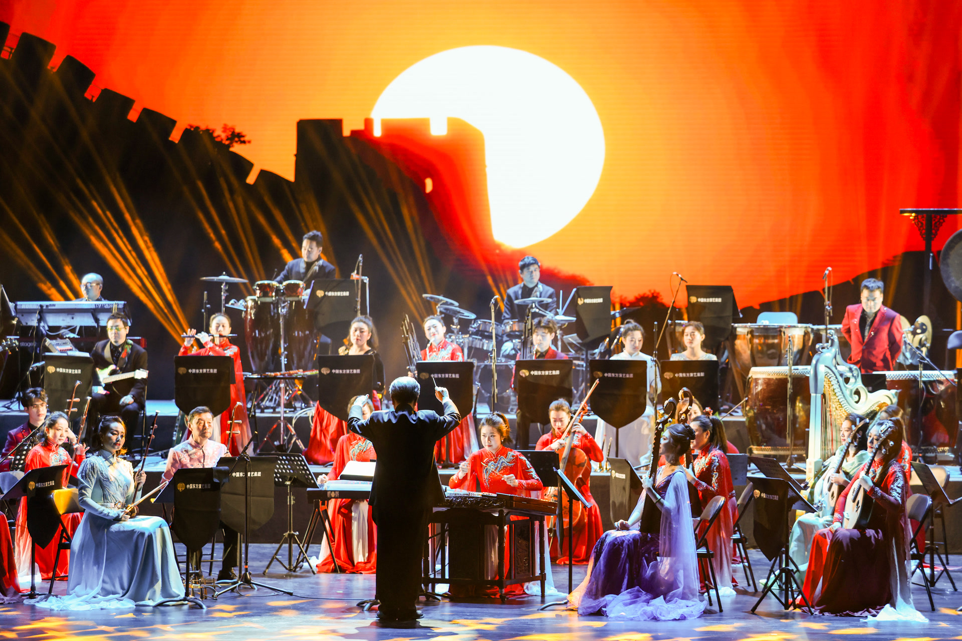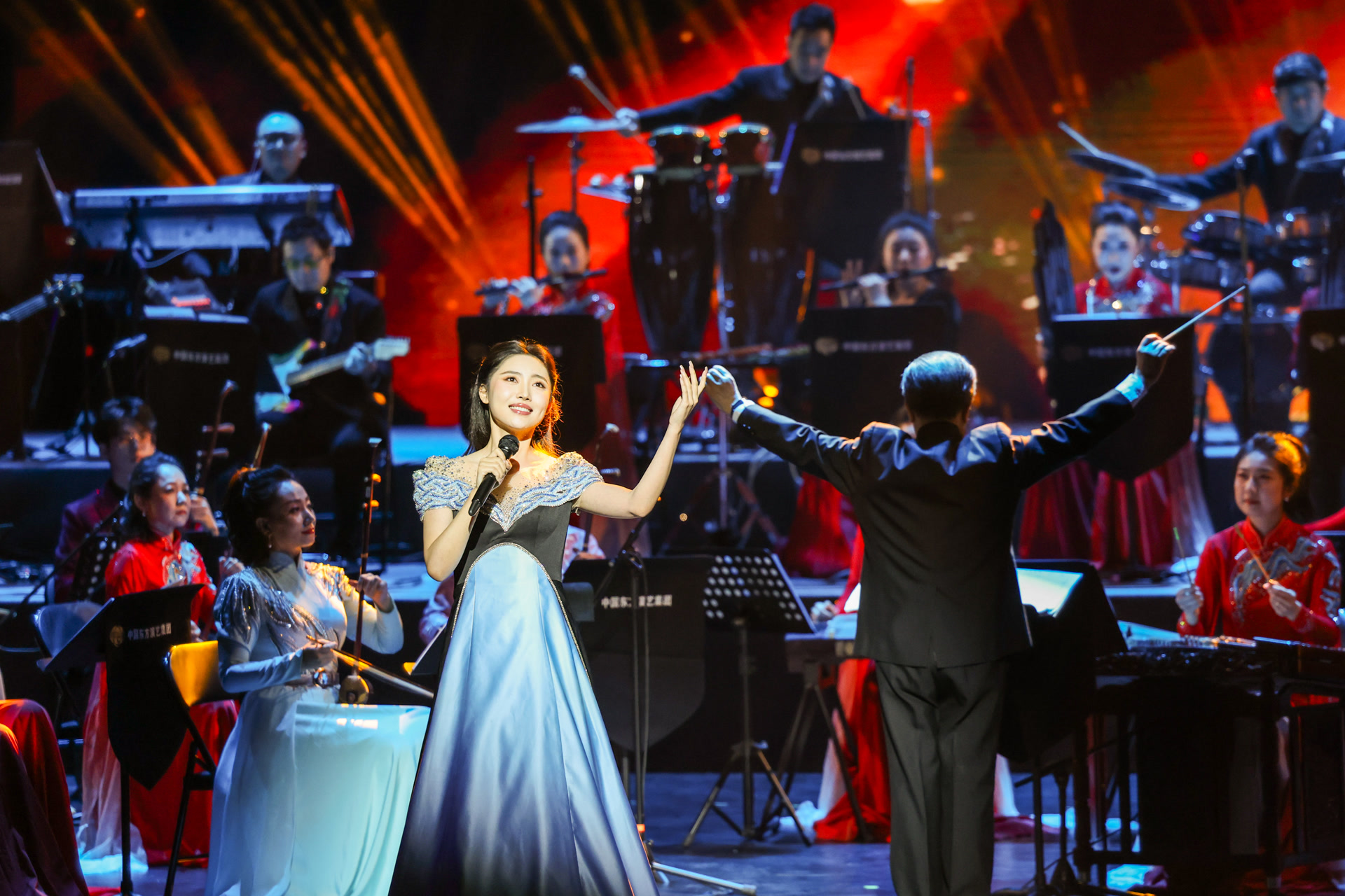 整场演出以民族器乐为核心。乐曲《辉煌》以恢弘激昂的旋律奏响开篇,《紫禁城》用悠扬曲调勾勒千年古都的庄重。随后,女声独唱《万疆》、乐曲《流沙》《鹤唳松山》、唢呐二重奏《百鸟朝凤》、男声独唱《鸿雁》等精彩不断。