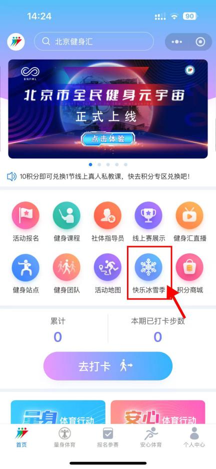 3.回到首页后点击“快乐冰雪季”板块,选择“2026年海淀区冰雪体验券发放活动”,点击“积分兑换”即可参与活动。