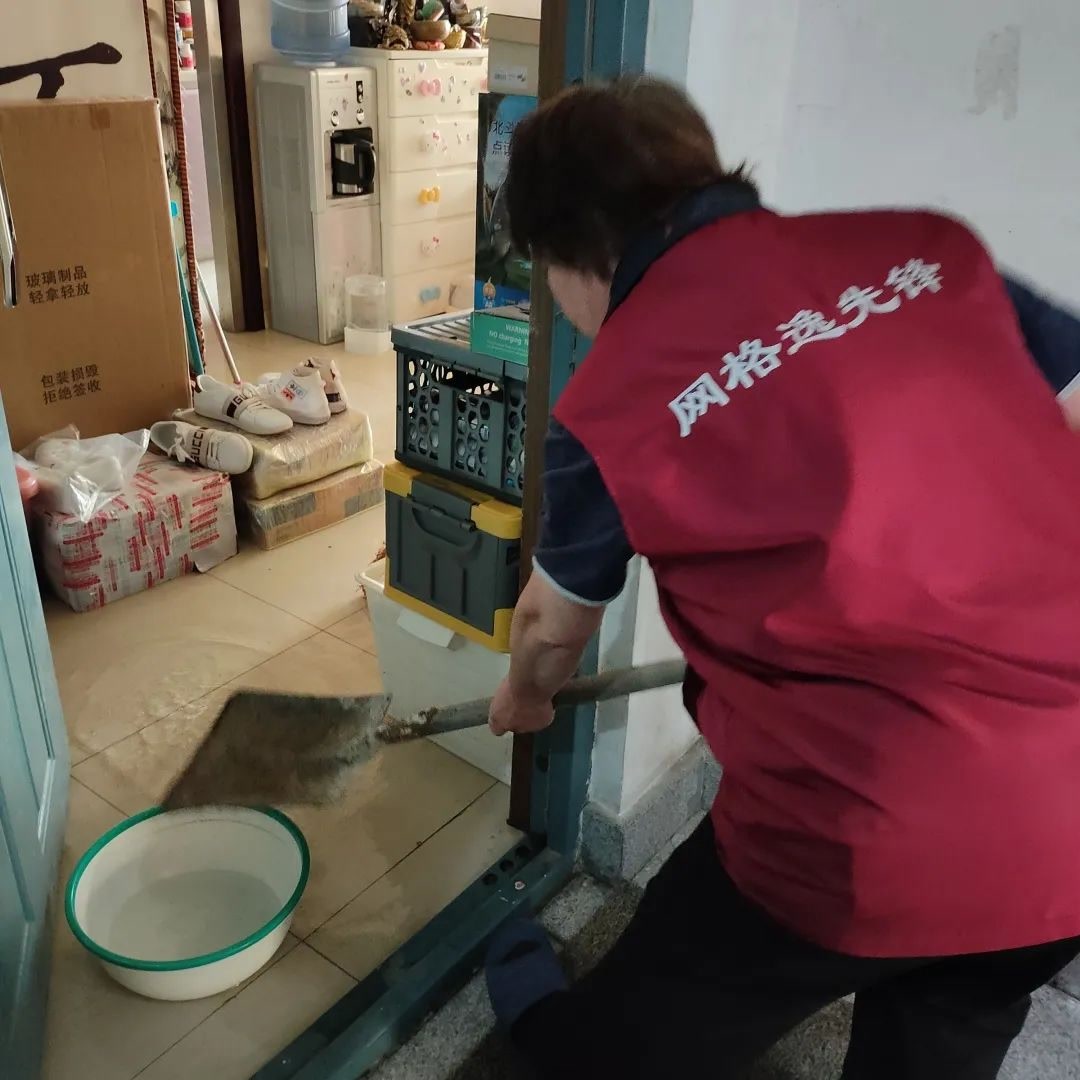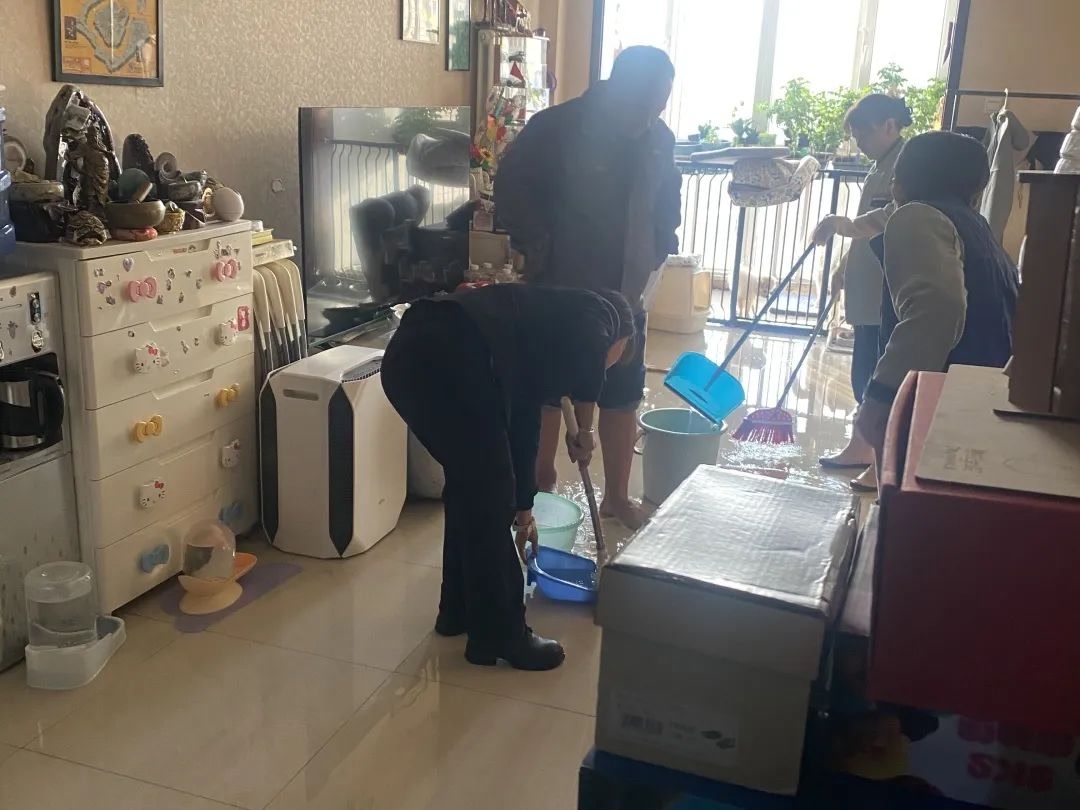 打开门的时候,屋内积水已漫了一地,部分家具的底部浸泡在水中。温大妈沉着指挥分工:“物业师傅赶紧关阀门,大家找桶和墩布舀水。”社区工作人员、保洁人员、物业维修师傅和热心邻居纷纷加入救援队伍,有人回家拿来抹布、拖把帮忙拖地,有人端着脸盆接力舀水。大家齐心协力,屋内及楼道积水很快就被清理干净。
