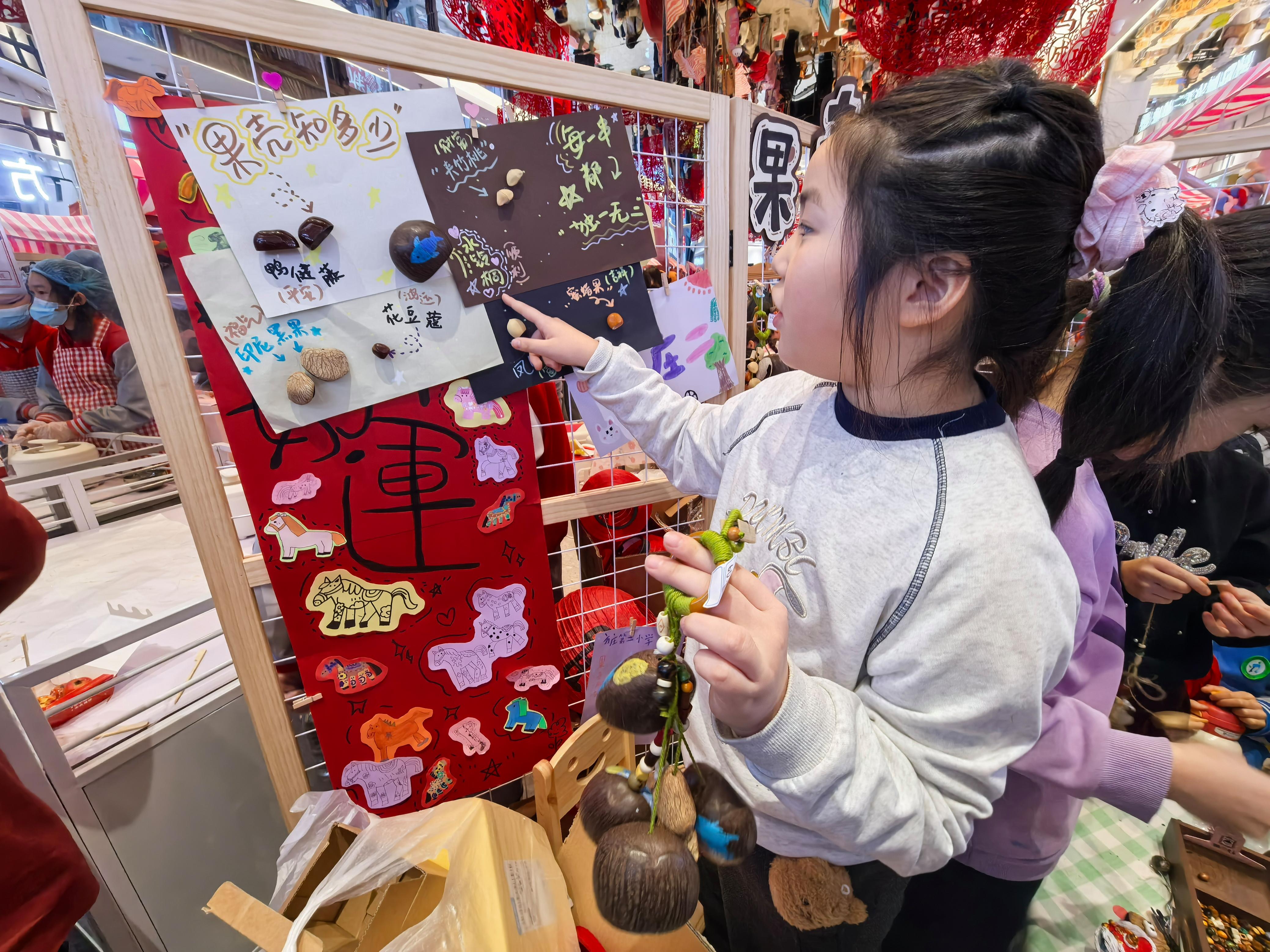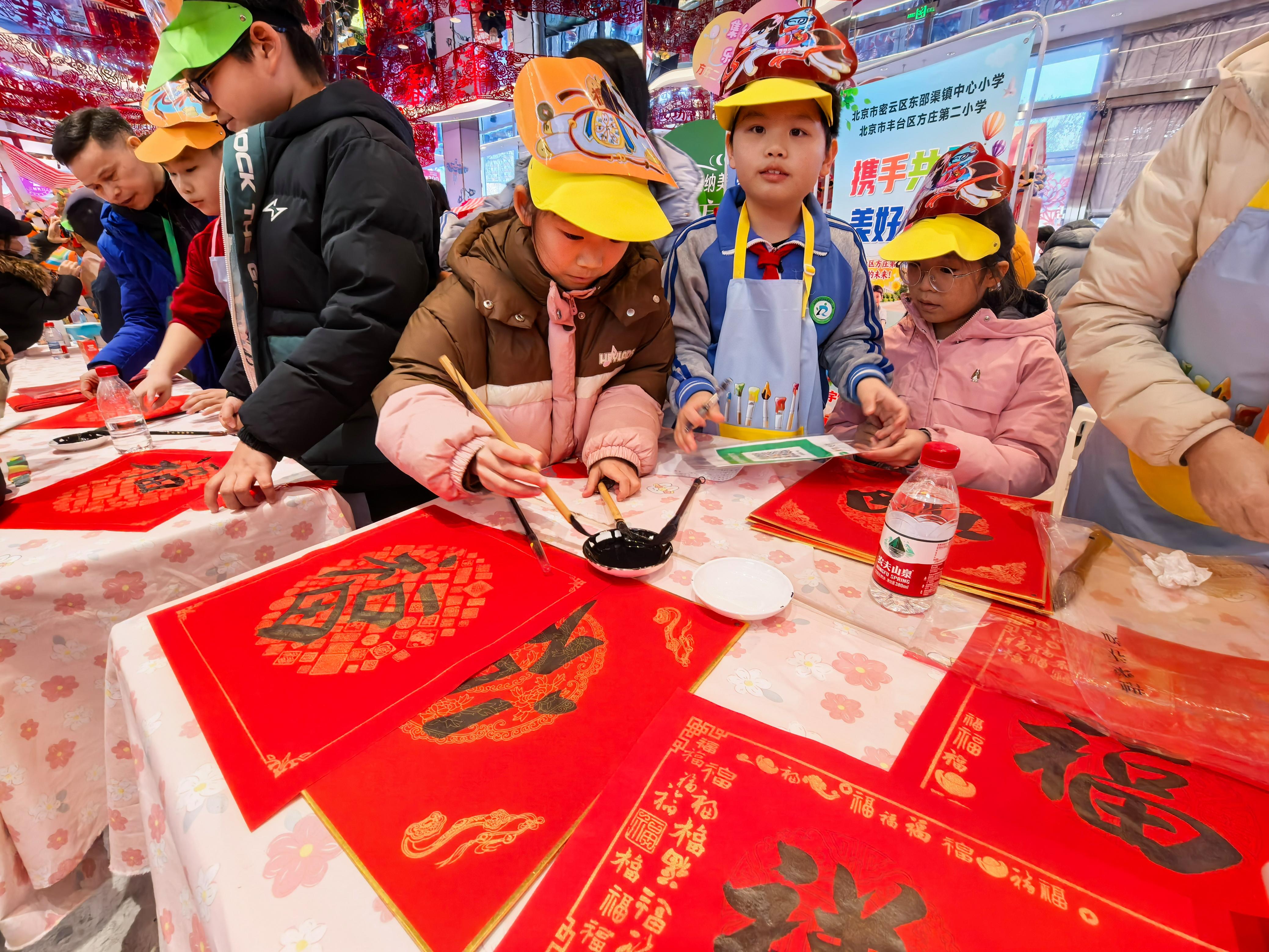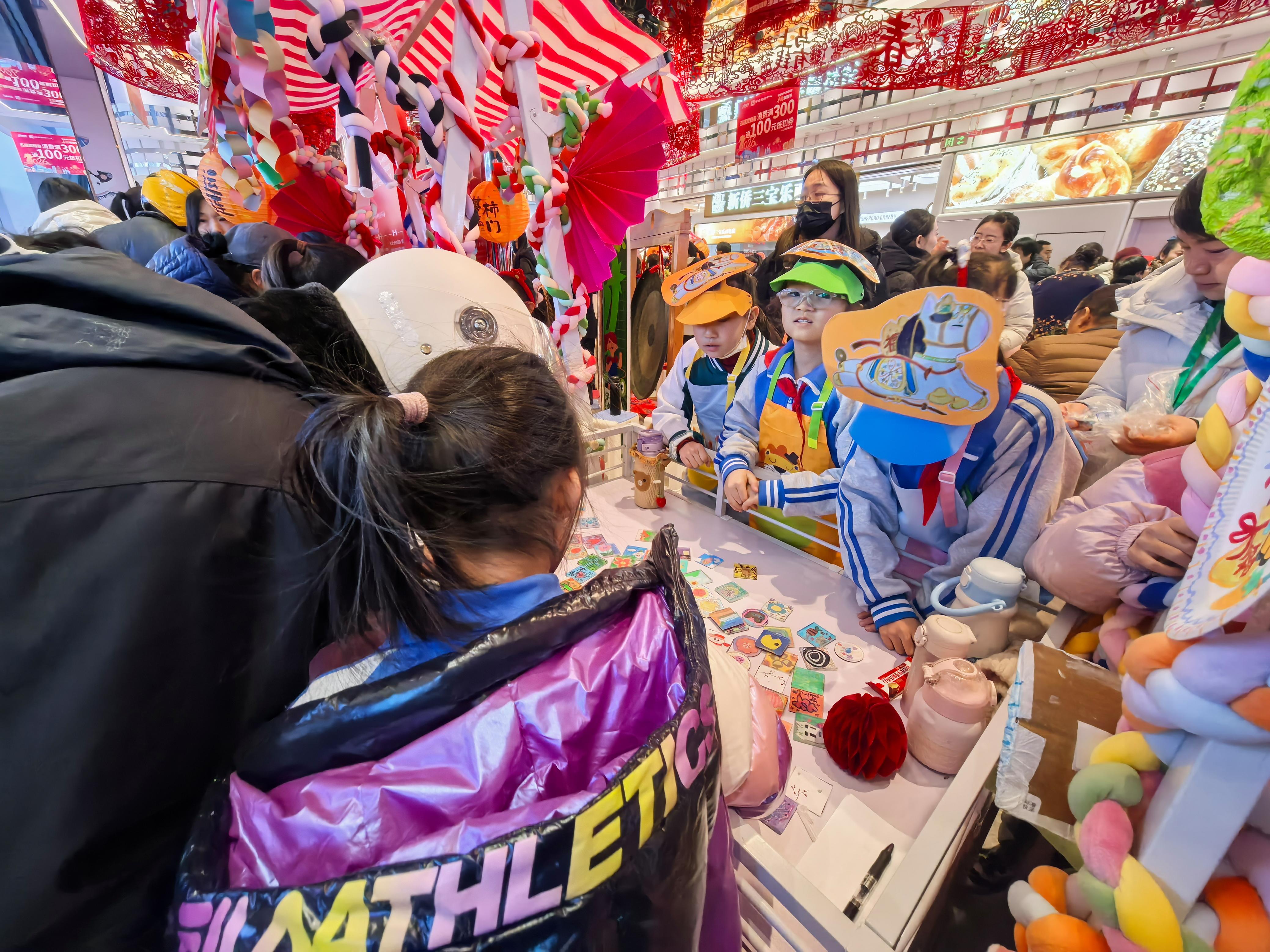 “瞧一瞧,看一看!方庄二小的茶叶等您品尝!走过路过不要错过!”方庄购物中心内人头攒动,手工冰箱贴、非遗剪纸、自制糖葫芦、书法写福字等10辆主题花车错落分布,一楼的非遗研学区与三楼的创意创作区遥相呼应。来自方庄二小3—6年级的学生与手拉手学校平谷夏各庄中心小学和密云区东邵渠镇中心小学的师生代表携手,化身“小小摊主”“非遗讲解员”“老字号店长”,将手工文创、平谷特产、非遗作品推向市集,吸引了不少市民购物观赏。此外,三宝乐、吴裕泰、同仁堂等老字号摊位前,32名经专业培训的“小小店长”从容服务,用稚嫩却专业的讲解诠释品牌文化,展现新时代少年的责任担当。
