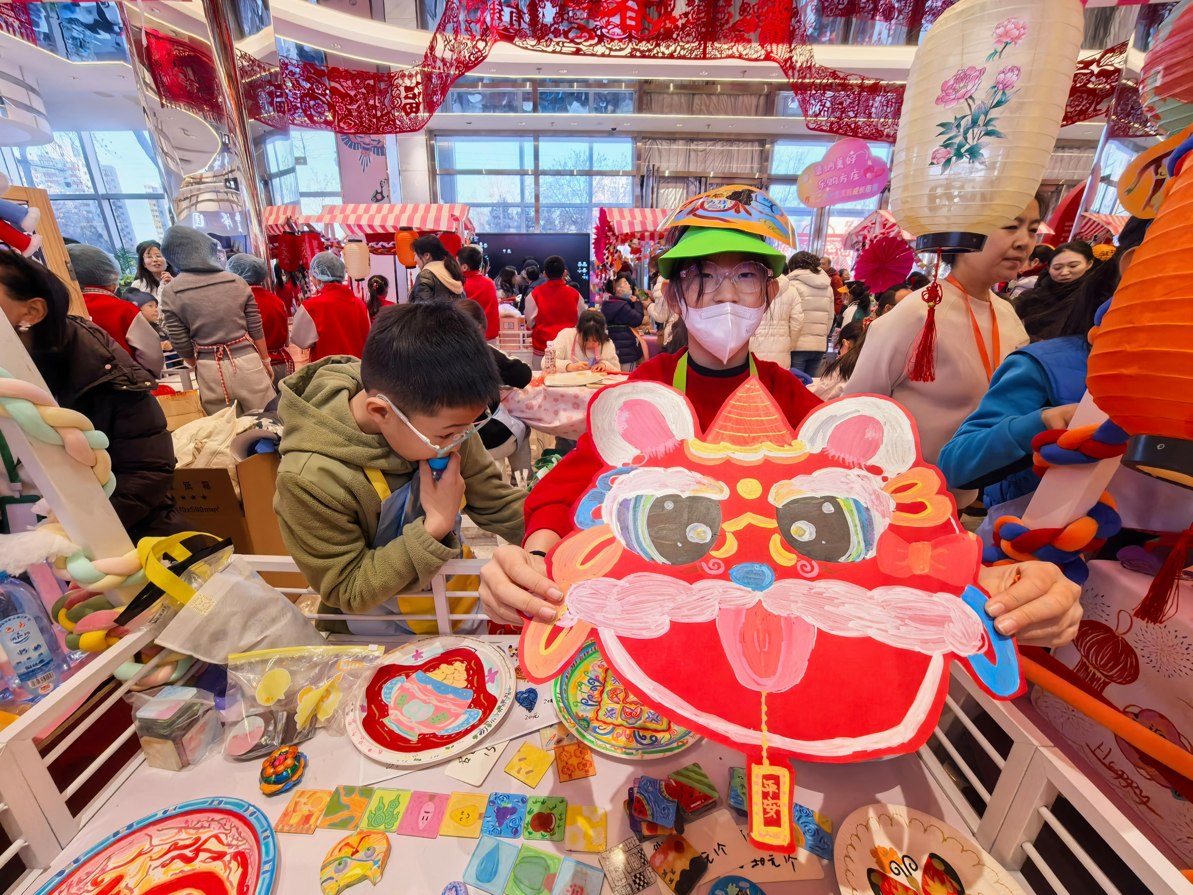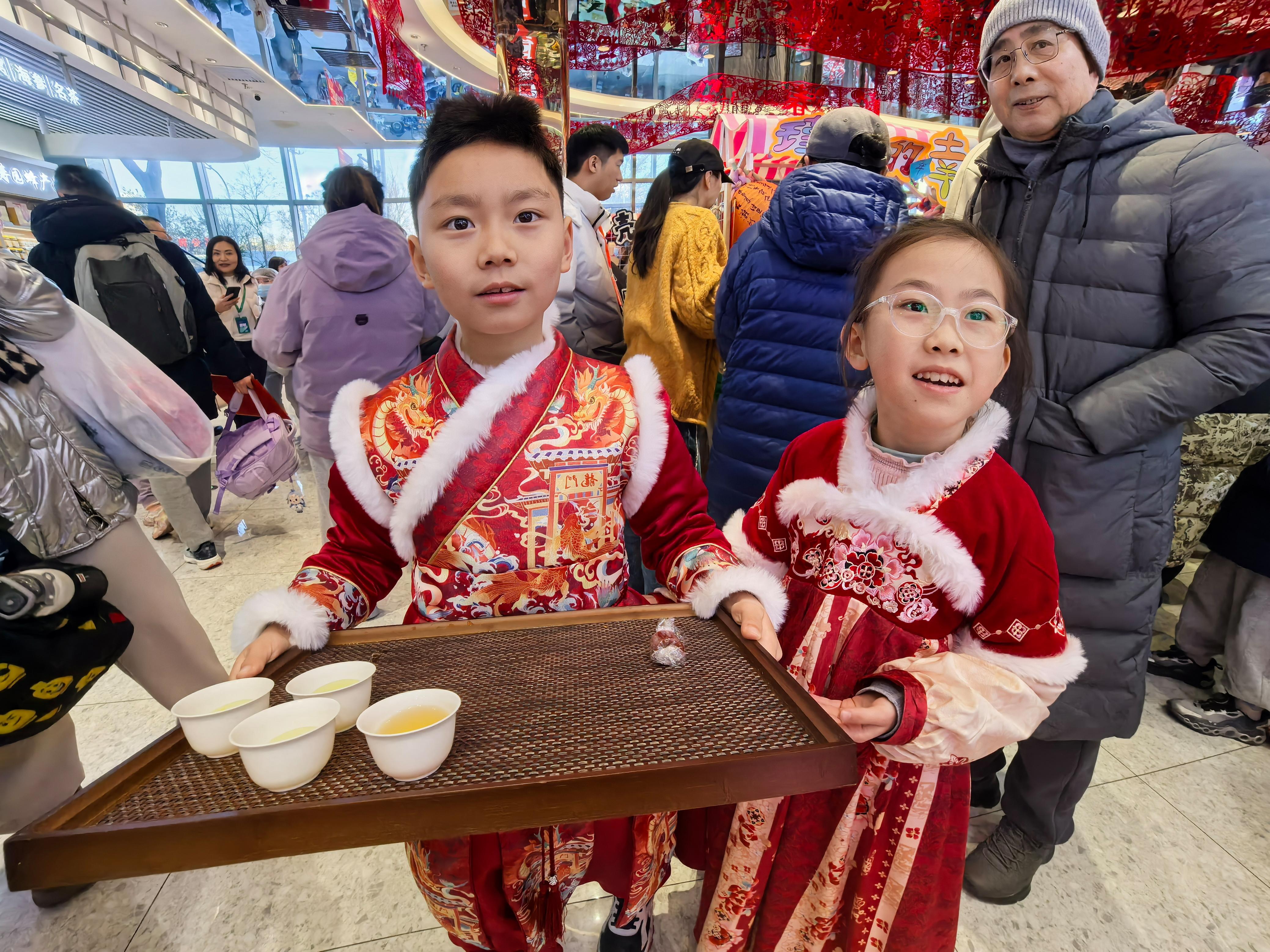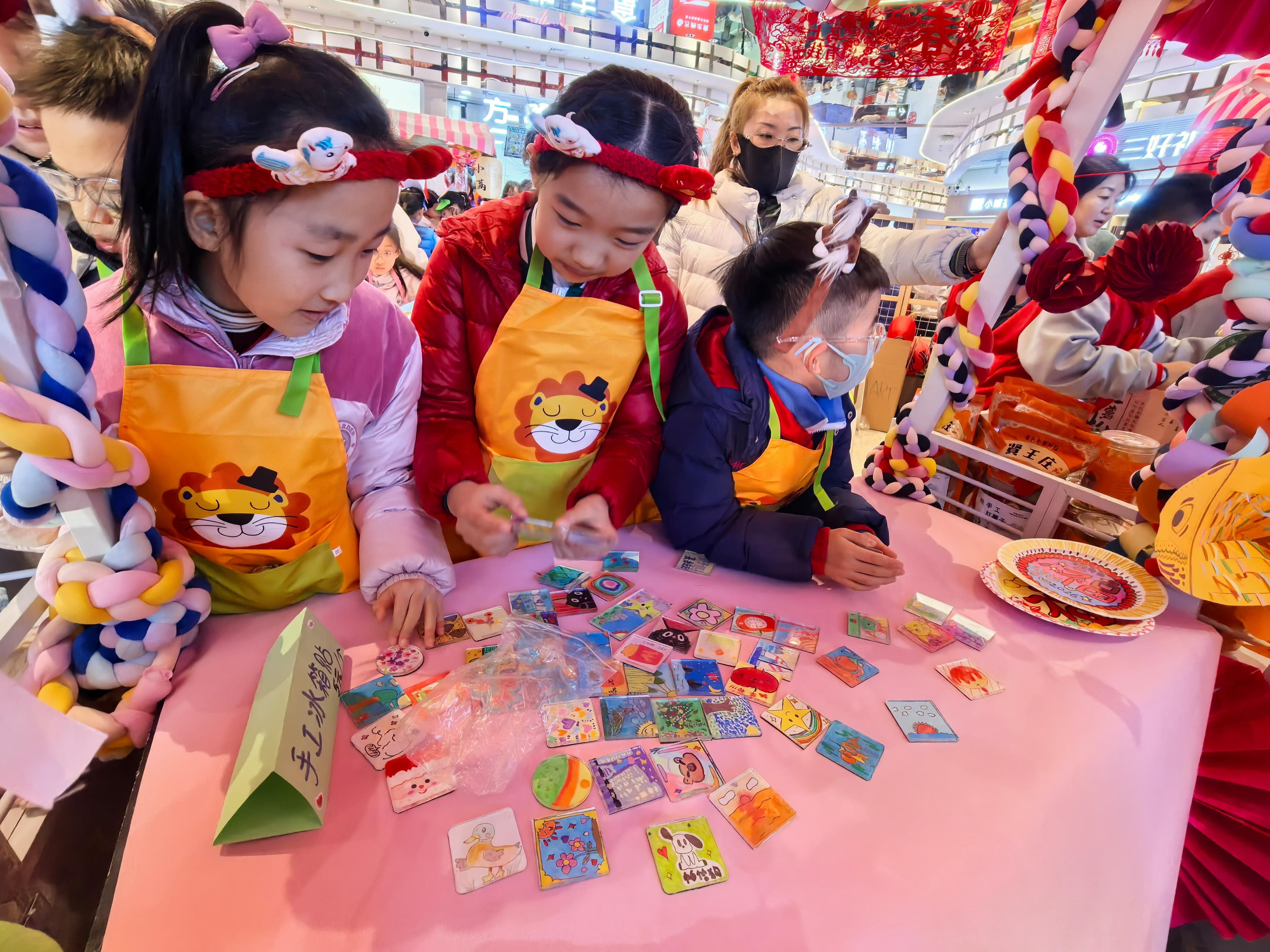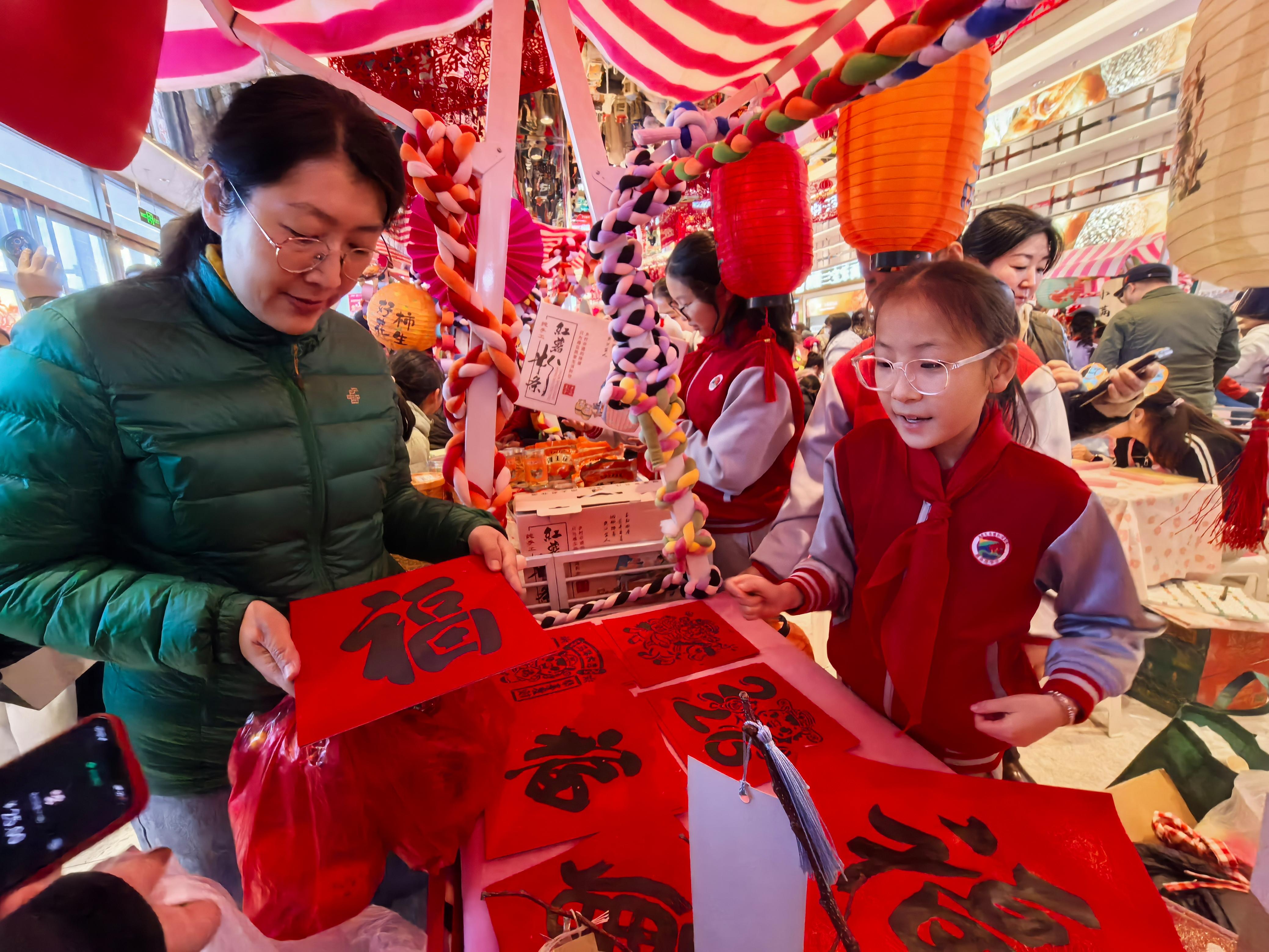 “瞧一瞧,看一看!方庄二小的茶叶等您品尝!走过路过不要错过!”方庄购物中心内人头攒动,手工冰箱贴、非遗剪纸、自制糖葫芦、书法写福字等10辆主题花车错落分布,一楼的非遗研学区与三楼的创意创作区遥相呼应。来自方庄二小3—6年级的学生与手拉手学校平谷夏各庄中心小学和密云区东邵渠镇中心小学的师生代表携手,化身“小小摊主”“非遗讲解员”“老字号店长”,将手工文创、平谷特产、非遗作品推向市集,吸引了不少市民购物观赏。此外,三宝乐、吴裕泰、同仁堂等老字号摊位前,32名经专业培训的“小小店长”从容服务,用稚嫩却专业的讲解诠释品牌文化,展现新时代少年的责任担当。