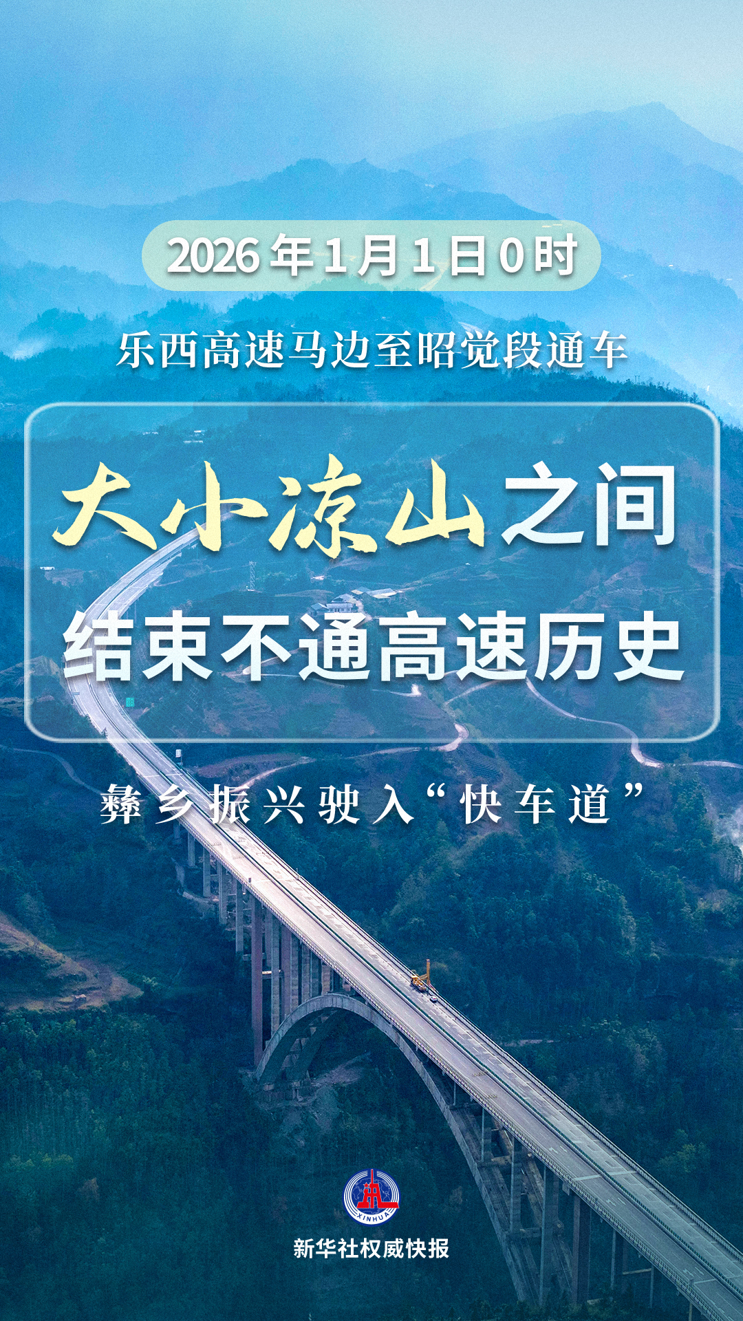 四川乐山至西昌高速公路马边至昭觉段将于2026年1月1日0时通车。乐山市马边彝族自治县地处小凉山,凉山彝族自治州昭觉县地处大凉山。这条连通大小凉山的高速公路,将改写彝乡闭塞的历史,使当地乡村振兴驶入“快车道”。
