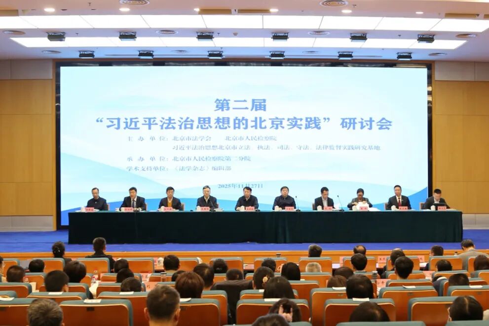 2025年11月27日,由市法学会、市检察院和习近平法治思想北京市研究基地共同主办的第二届“习近平法治思想的北京实践”研讨会在市检二分院召开。中国法学会党组书记、常务副会长王洪祥;市委常委、政法委书记,市法学会会长谈绪祥;市检察院党组书记、检察长朱雅频;中央全面依法治国办秘书局副局长艾强等出席研讨会并致辞。与会人员聚焦党和国家中心工作,紧扣理论和实践前沿问题,围绕强化新时代检察机关法律监督工作的努力方向、习近平法治思想引领下北京法院服务保障民营经济工作机制的实践路径、生成式人工智能嵌入经济犯罪侦查的思考、行政救济法视域下行政争议实质性化解机制的整合及完善、刑事诉讼法修改“证据独立成编”的基本思路等内容开展深入研讨,推动理论研究与实证研究的良性互动。