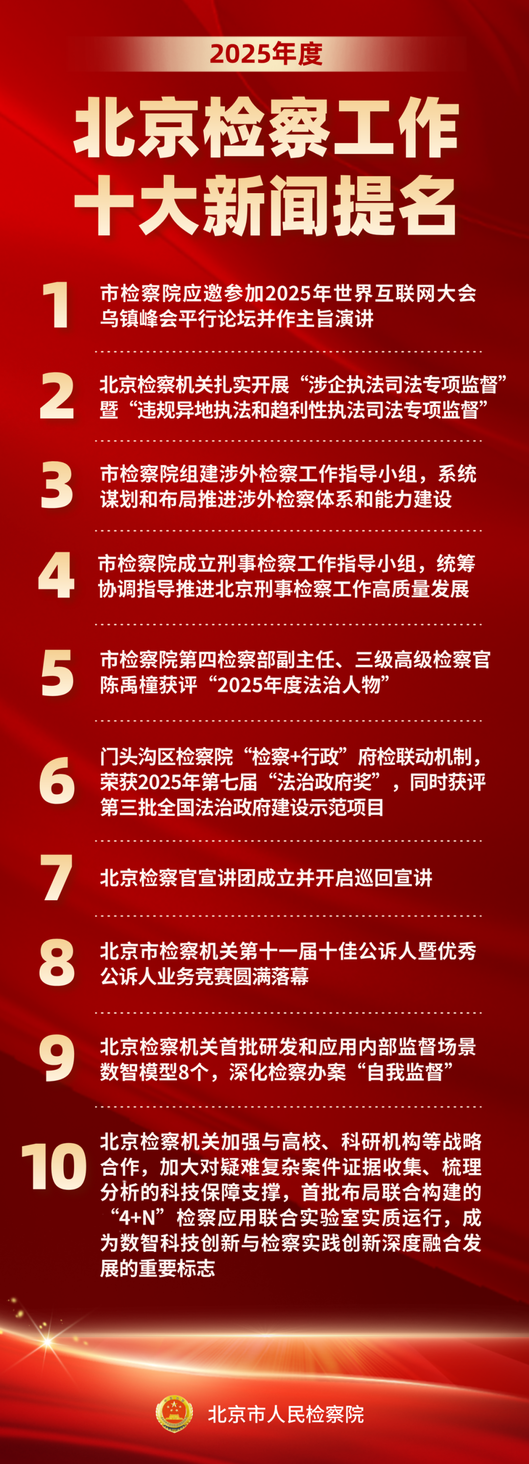 潮平海阔,千帆竞秀。即将过去的一年,北京检察机关坚持以习近平新时代中国特色社会主义思想为指导,坚定拥护“两个确立”、坚决做到“两个维护”,围绕市委、最高检关于贯彻党的二十大和二十届历次全会部署的要求,紧扣强化检察监督、保障国家法律统一正确实施的职责使命履职,为大局服务、为人民司法、为法治担当。值此岁末收官之际,“京检在线”评选出2025年度北京检察工作十大新闻及十大新闻提名,以期在盘点总结、全景展示中为实干担当留下生动注脚,为接续奋斗吹响嘹亮号角!