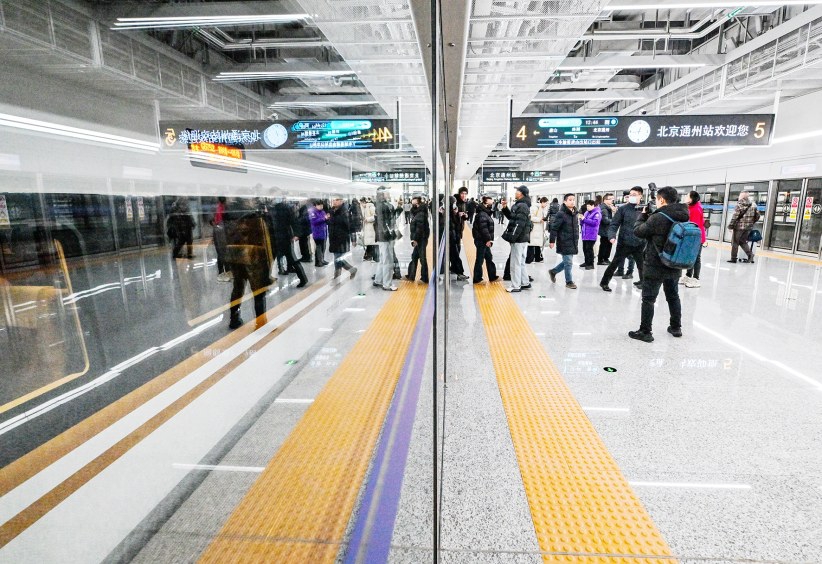 车站广播这时候突然响起:“G6751次列车,北京通州开往唐山,即将开始检票。”人群微微涌动。乘客冯女士一边向检票口走去,一边对记者说:“我就是想来感受一下首趟车。感觉车站特别大气、干净,指引清楚,连洗手间都有热水,细节做得很好。工作人员也特别耐心。”