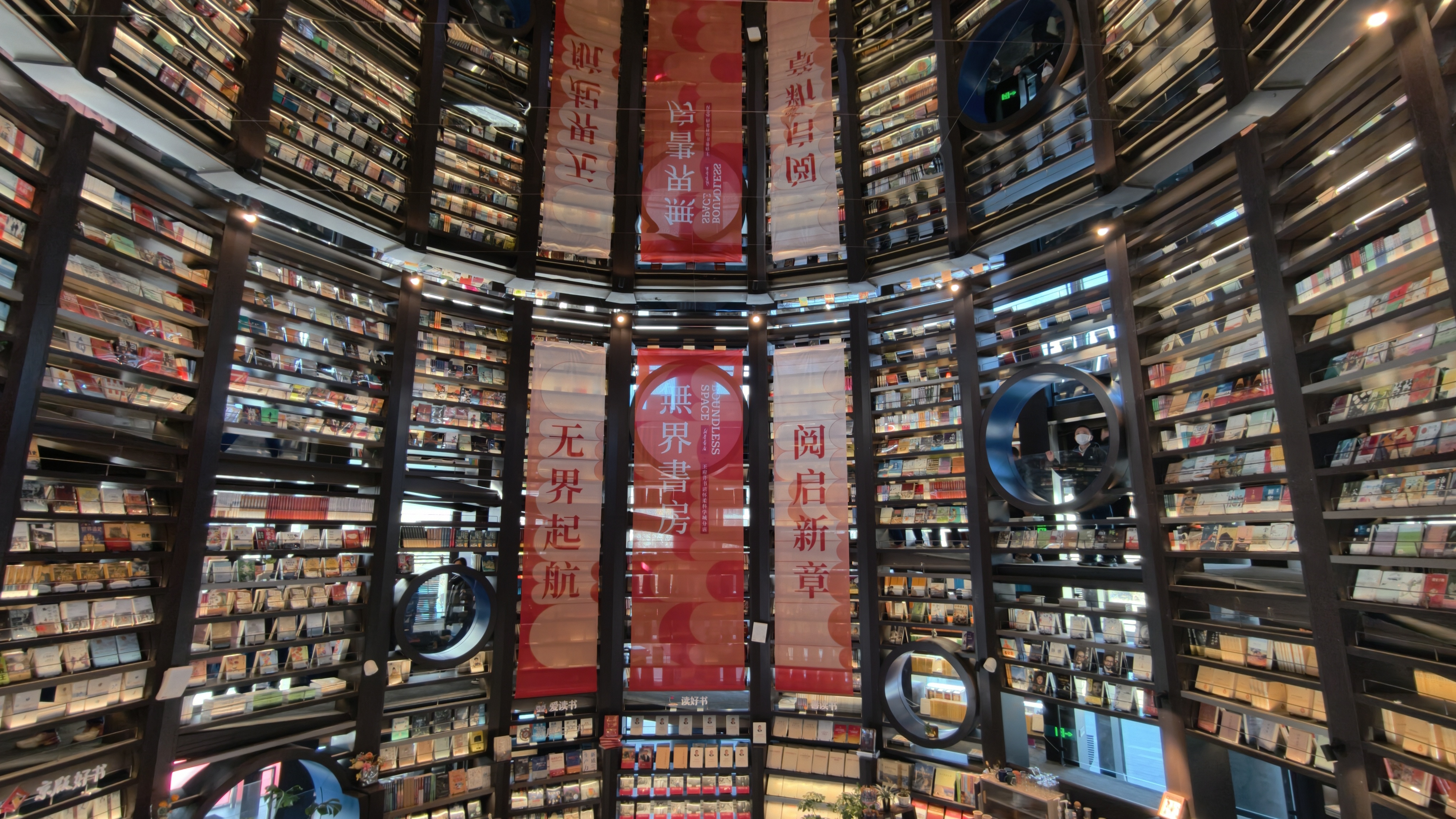 “无界书房”整体经营面积500余平方米,整体设计利用建筑净高空间,环形的书架和螺旋形环绕的坡道,既保障充足藏书量,更营造出“无限向上”的独特空间体验,象征着人类对科学边界的不懈探索。步入其中,读者仿若置身知识的螺旋星系,每一步攀登都与科学精神共鸣。