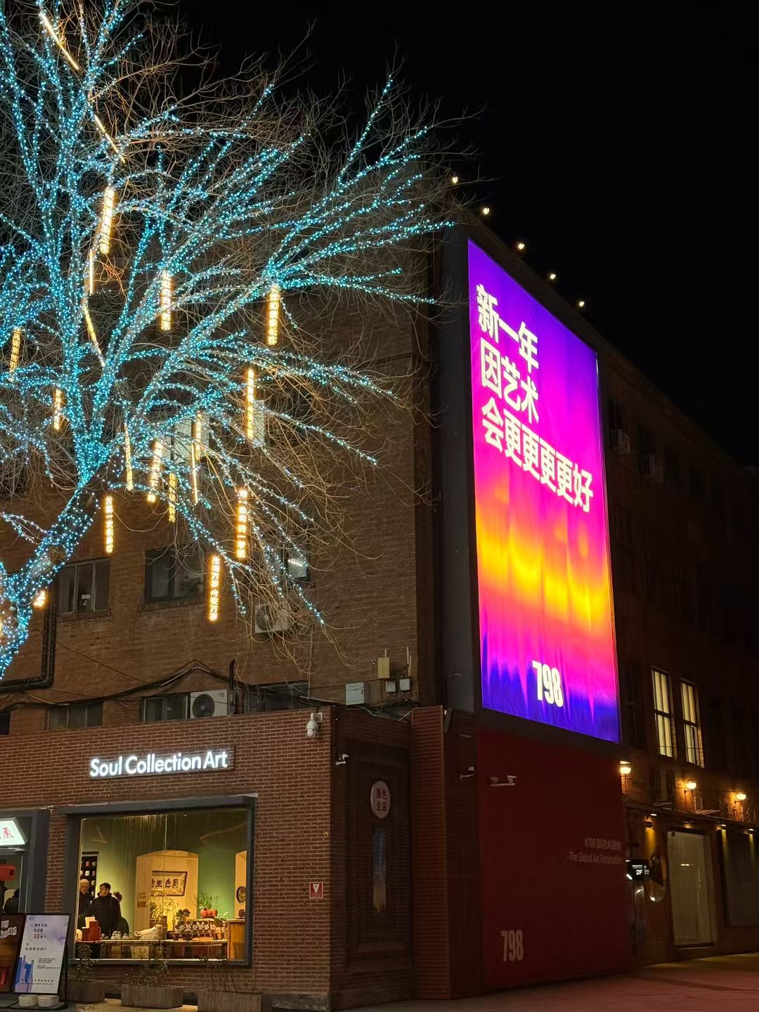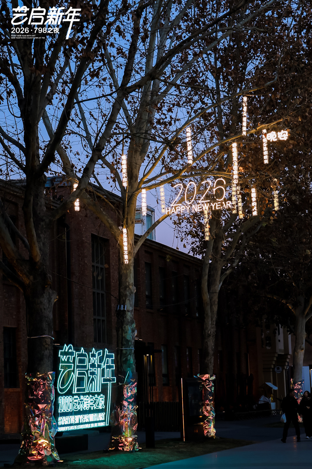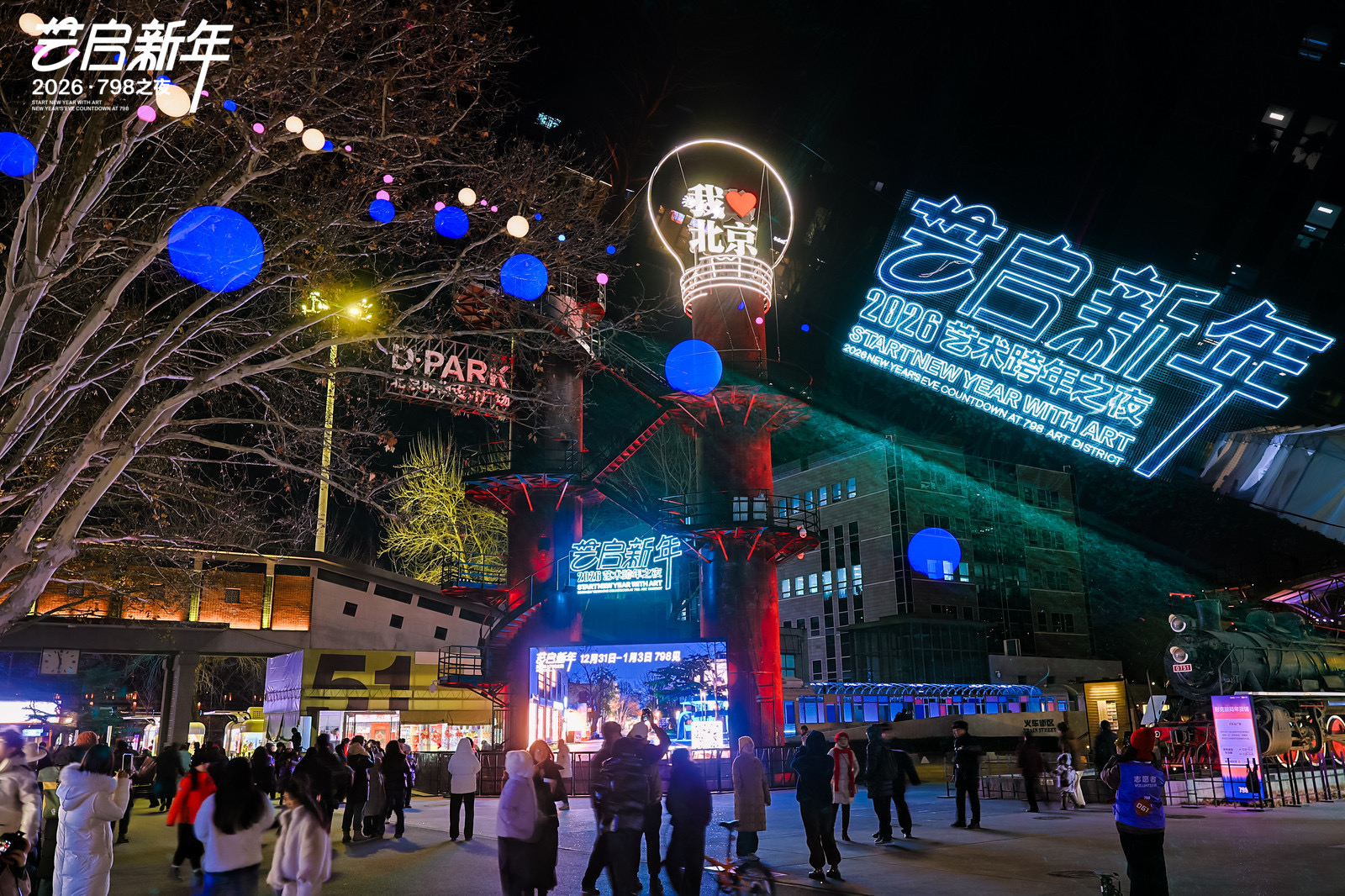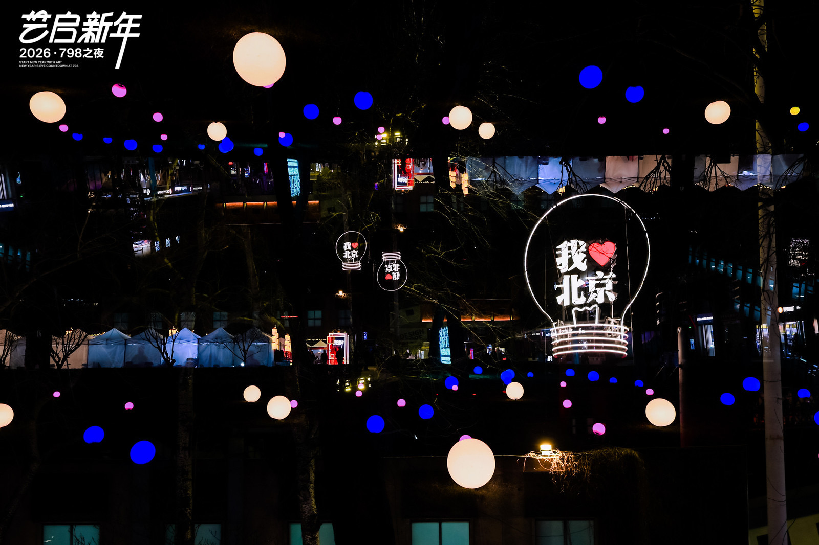 这个跨年夜,798园区的拍照打卡点可太多了。经典打卡点“我爱北京 新年快乐”主题墙今年升级为1400平方米的立体装置“亲爱的北京,新年快乐”,成了园区最热门的合影背景。广场树上悬挂着心愿的灯饰,与同心广场上,源自五条人乐队灵感的大型装置“烦恼回收袋”一同,营造出温馨而富有哲思的迎新氛围。