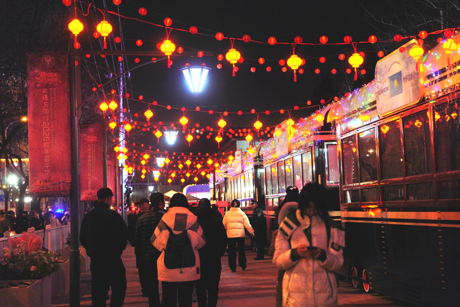 2025年12月31日晚,北京语言大学东门外的文明互鉴列车主题文化公园热闹非凡。“语绘寰球·悦动新年——北语万国驿2026跨年嘉年华”开幕,中外师生与市民一起迎新年。元旦假期期间,文化体验、美食品鉴、文创市集等新年活动将持续开展。