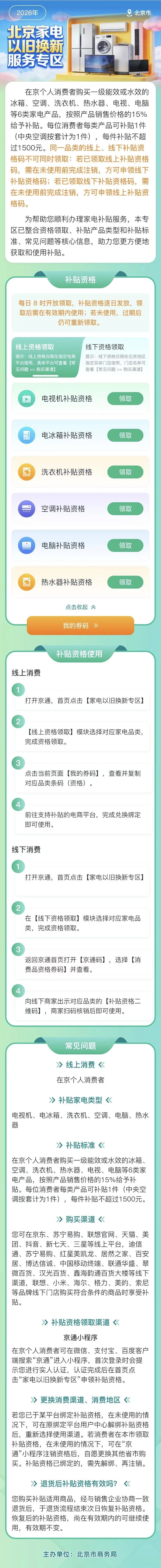 消费者通过京通小程序完成实名认证后,可进入“家电、数码以旧换新专区”领取线上或线下补贴资格,并前往政策参与企业线上商城或线下门店购买政策补贴范围内商品。补贴资格每日上午8点开始发放,领取后须在有效期内使用(当月有效,后期视情调整);逾期未使用补贴资格的,过期后仍可重新领取。