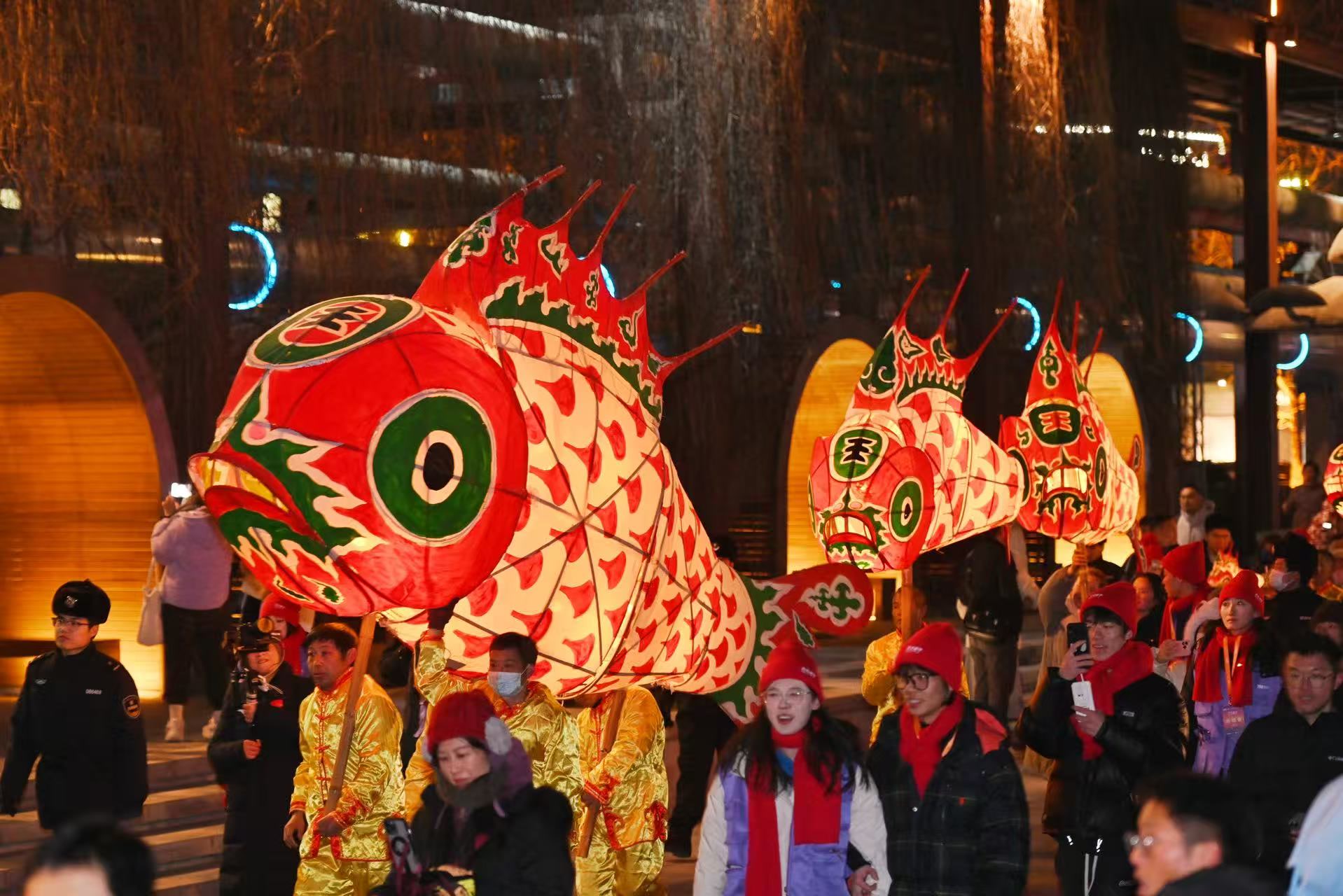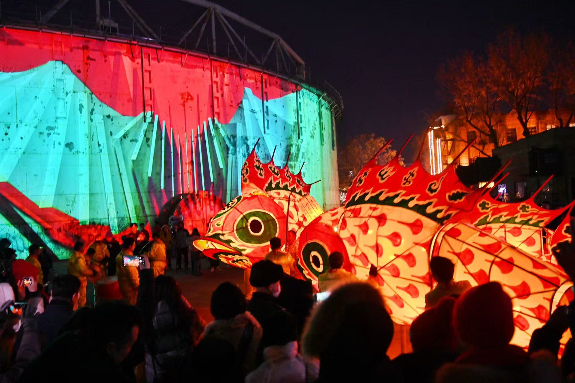 此次前来表演的20多名队员都来自安徽汪满田村,有着30多年的鱼灯表演经验。鲤鱼灯吐珠似跃龙门,灯笼的暖光透过竹篾骨架,在斑驳的工业风墙面上投下灵动的光影。鱼灯队的表演形式十分丰富,队首四人负责挑花灯、敲锣和打鼓,表达风调雨顺、国泰民安的希冀,并控制整个鱼灯团队的游走与表演节奏,紧接着是由大到小排序的鱼灯。