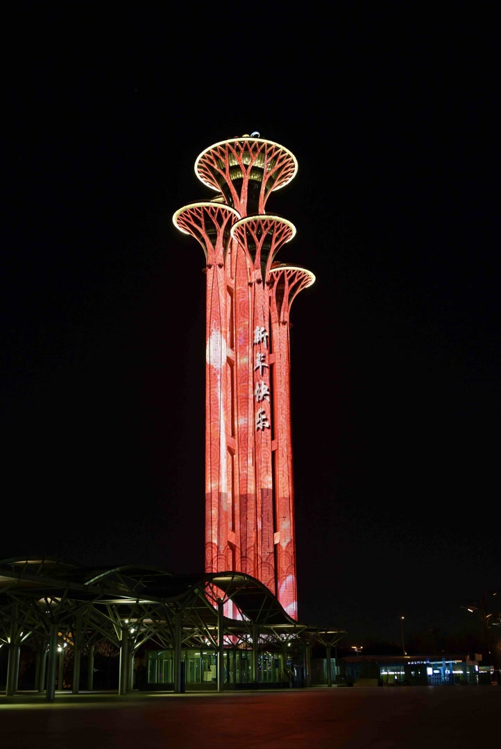 夜色中,奥林匹克塔披上喜庆热烈的“中国红”,动感闪耀的“新年快乐”字样在塔身上交替浮现,与漫天光影交织成浪漫图景。