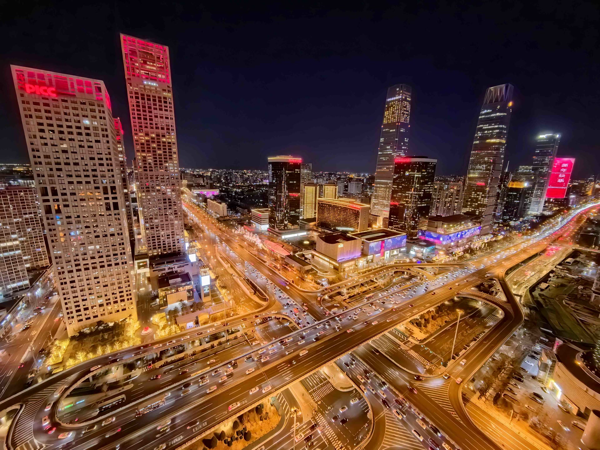 在北京CBD,街区宛如一条流动的星河,建筑顶部的金色灯光在夜色里熠熠生辉。矗立在三环沿线的京广中心同样换上亮眼“红装”,灵动的光影特效在幕墙上轮番上演,呈现出光影交融的绝美画卷。