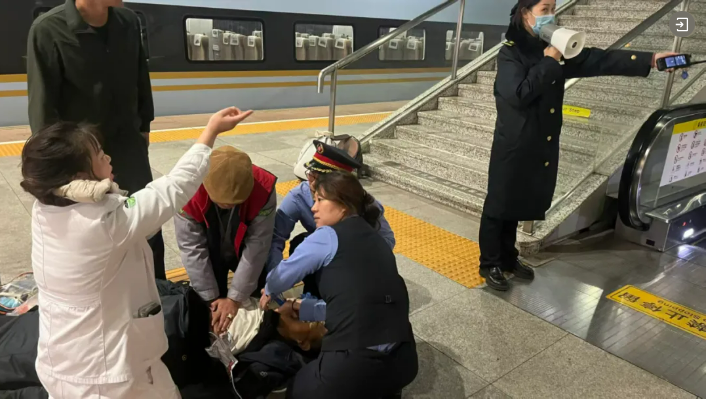 对讲机的呼救声刚落,同事武志广便飞奔而至。他发现旅客颈动脉搏动微弱、有窒息征兆,立刻和众人将旅客转移到平地,跪地展开心肺复苏。与此同时,车站迅速启动应急程序,立即呼叫站内常驻的999医生,同时联系120急救中心,其他工作人员有序疏散旅客,确保了急救通道畅通无阻。