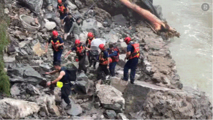 进山之路异常凶险,多处道路被山洪完全冲塌,巨大缺口截断前路。面对“道路尽毁”的境地,海淀消防指战员凭借过硬技能,在湿滑崖壁就地取材,快速架设救援绳索系统。有行动能力的群众在队员们严密保护下抓绳通过;对于老人、儿童和伤员,消防员则毫不犹豫俯身背负。现场指挥员郭世剑坚定表示:“路断了,但群众在等!我们必须继续前进!”