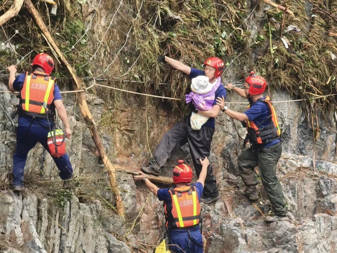 转移途中,海淀消防员的细致守护处处可见。有合力抬送轮椅损坏的老人,也有两人一组小心翼翼抬着4个月大婴儿的婴儿车,在乱石泥水中开辟安全通道。泥泞中,是他们深一脚浅一脚跋涉的身影;断崖边,是他们紧握绳索、全力护卫的臂膀。