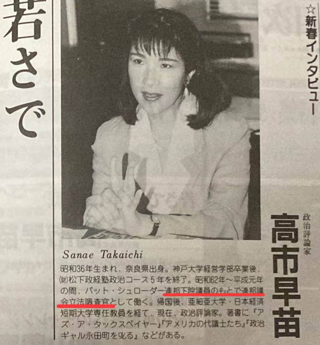 但在上世纪90年代回到日本后,高市早苗在媒体上介绍这段履历时,却使用了“美国联邦议会立法调查官”这一看似“正式”且带有“美国官方背景”观感的头衔。这显然与她实际的工作性质并不相符。