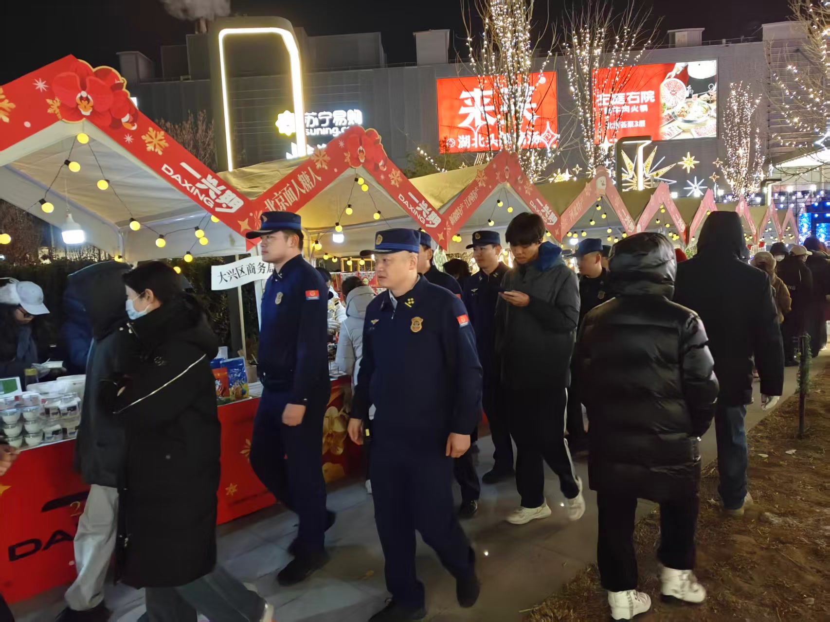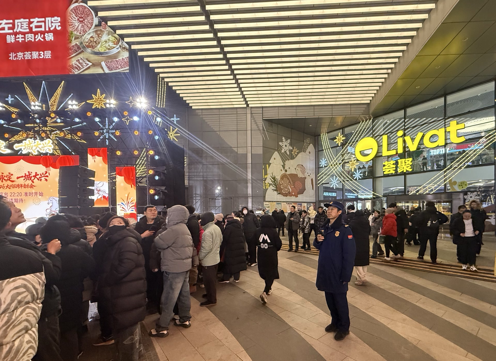 12月31日晚,北京大兴区西红门荟聚购物中心张灯结彩,一场盛大的跨年夜活动吸引了数万市民。在热闹的人群中,一群身着“火焰蓝”制服的消防员格外醒目——他们穿梭在重点区域巡查,为这场岁末狂欢筑起一道坚实的安全屏障。