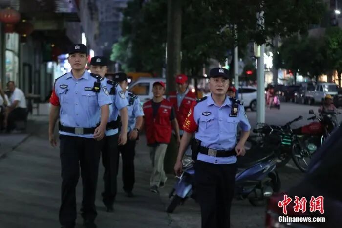 资料图:2024年8月27日,安徽省金寨县南溪派出所民警在南溪镇街区开展夜间巡逻。
