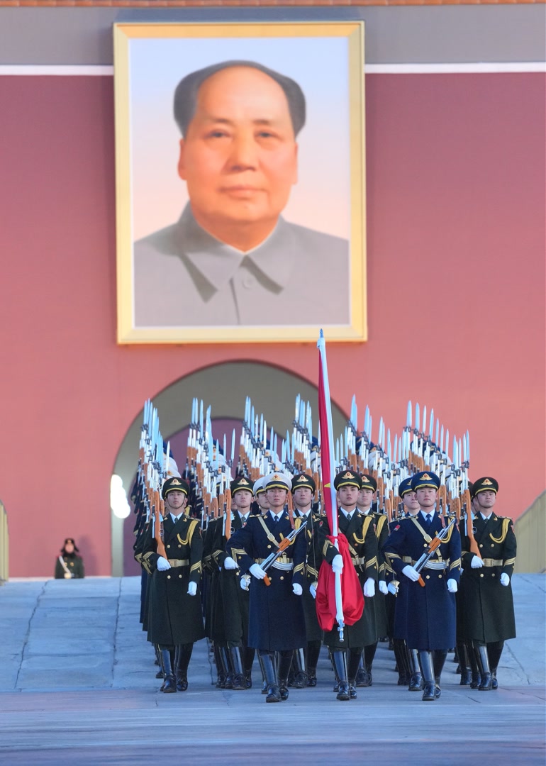 7时30分,嘹亮的升旗号角划破晨空,人群瞬间安静下来。只见国旗护卫队的队员们身着笔挺的军装,迈着整齐划一的步伐从金水桥走来。从金水桥到国旗杆下,103.5米、正步138步,军靴踏在地面上的声音铿锵有力,敲在每个人的心尖上。现场观众纷纷举起手机,定格下这令人热血沸腾的画面。
