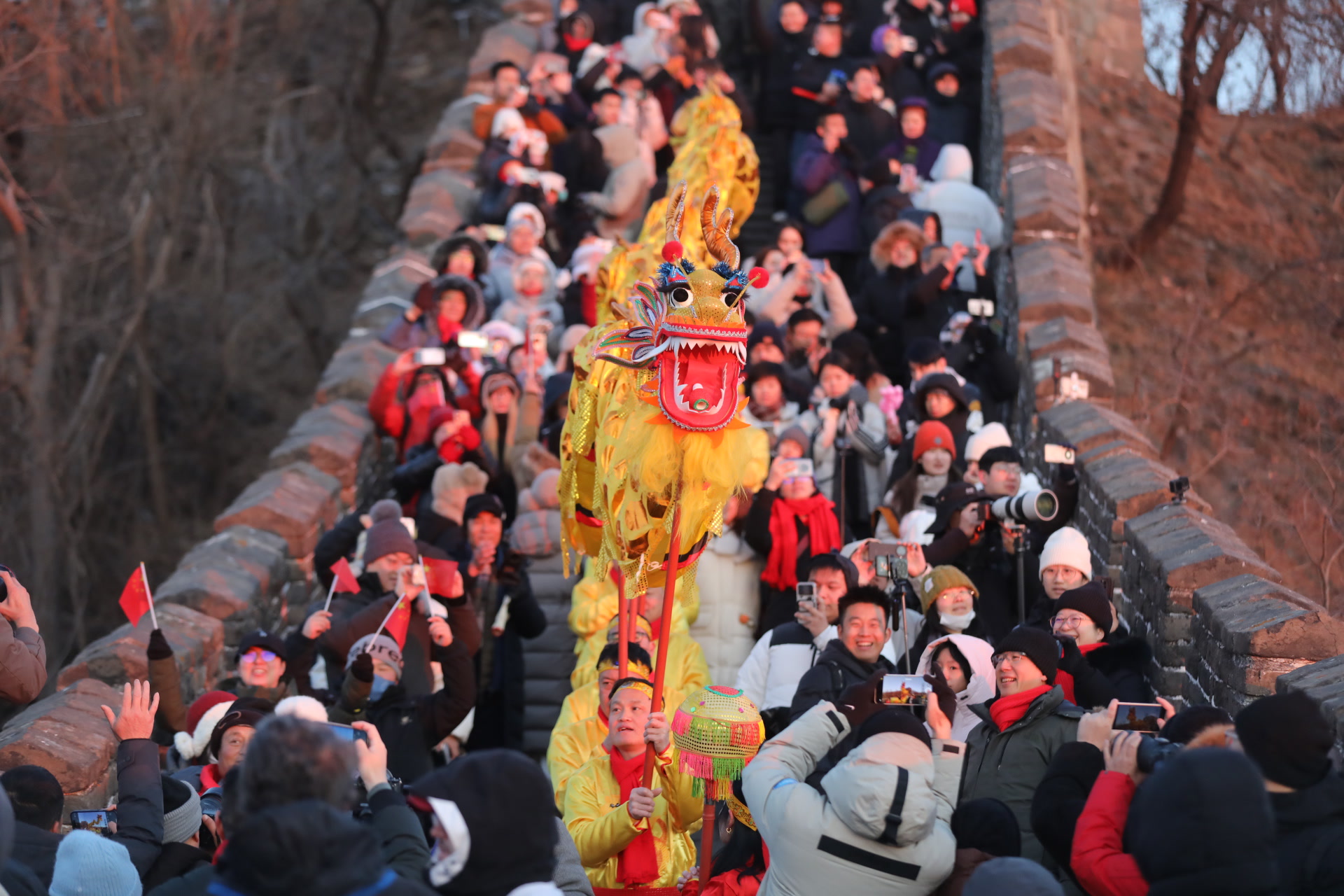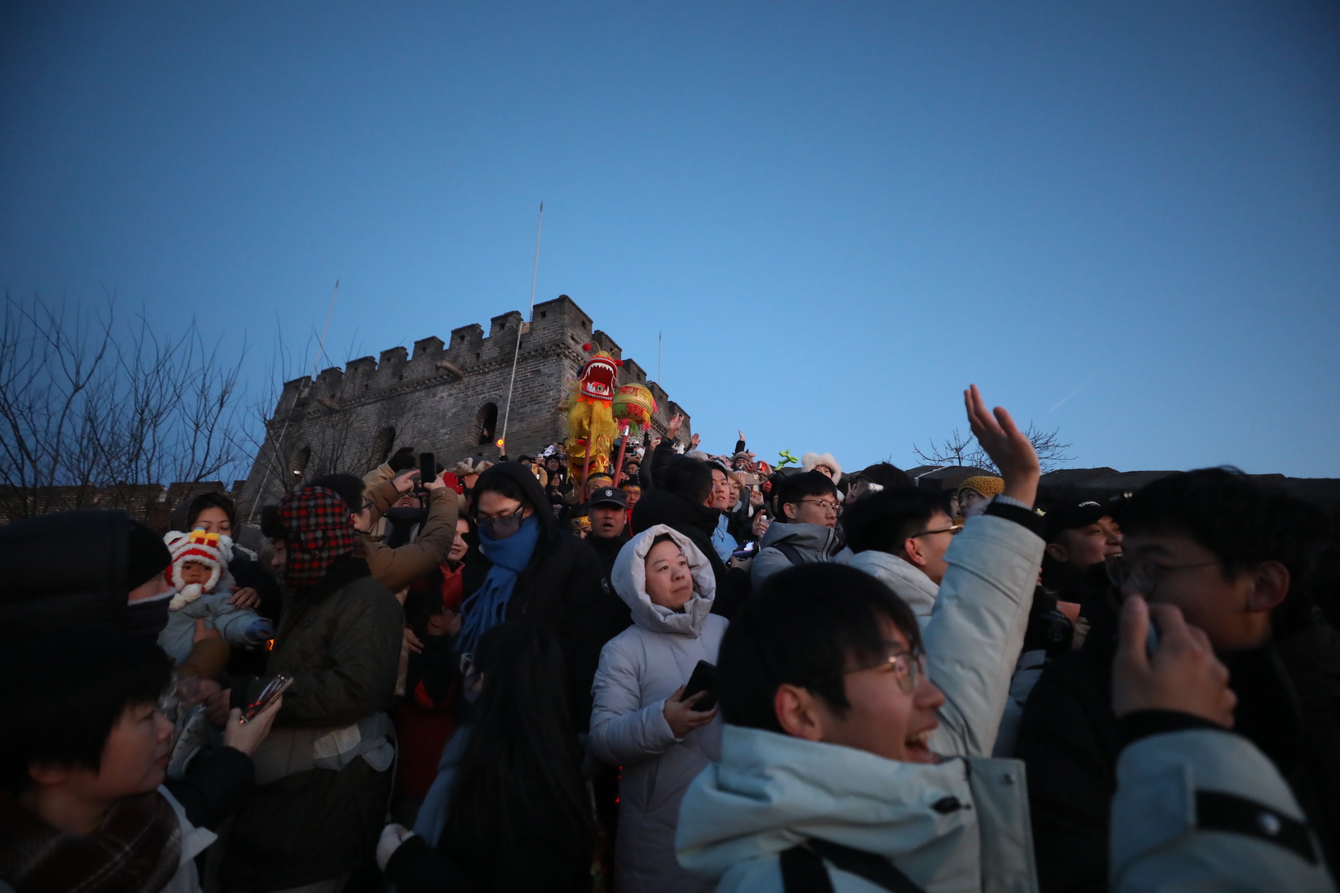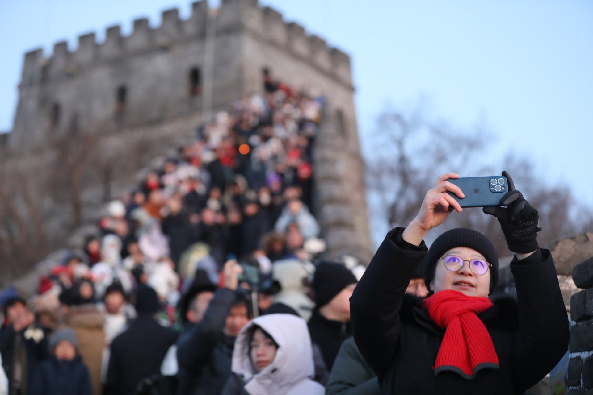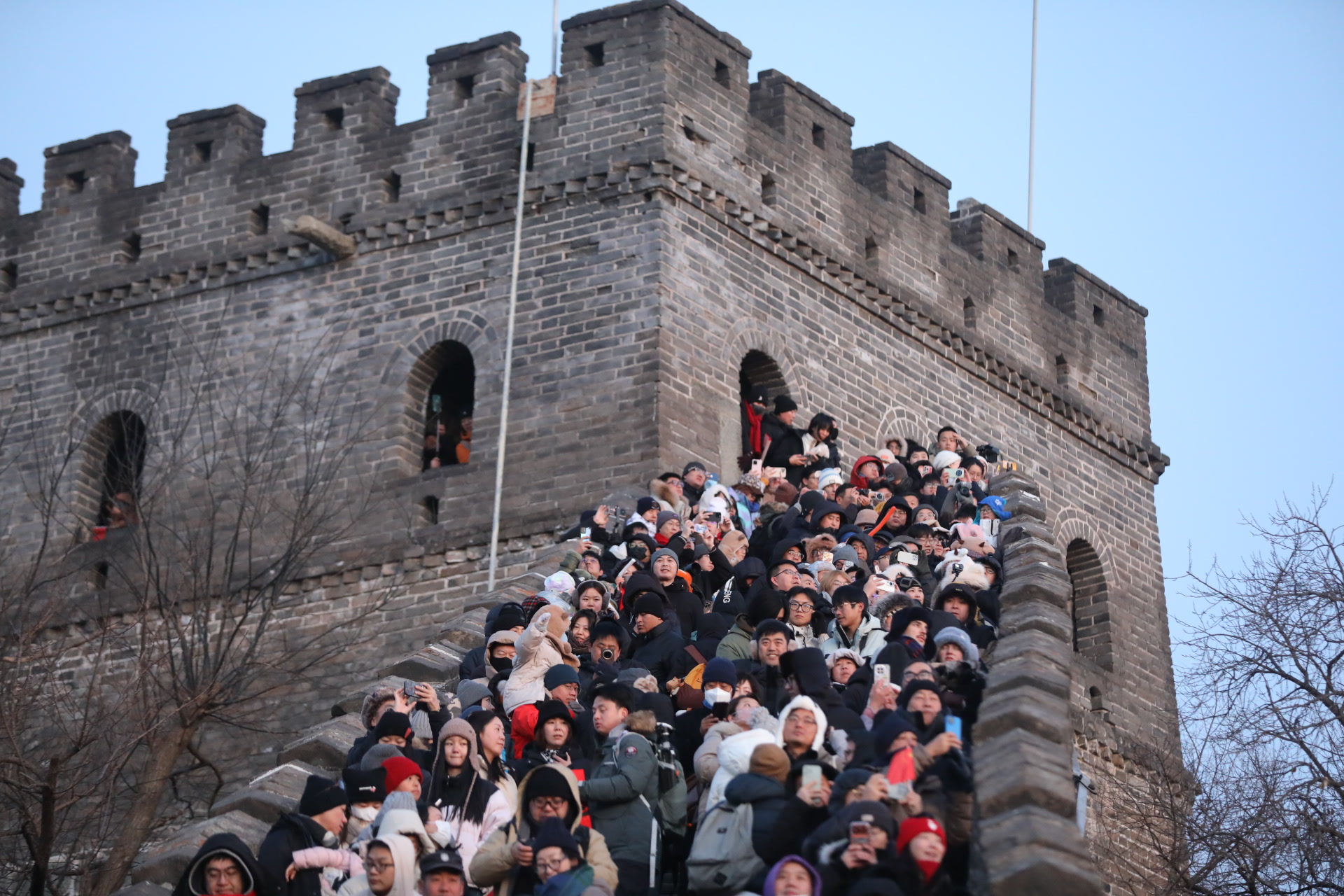 尽管气温低至约零下12摄氏度,但游客们热情高涨,脚步声早早打破了长城的宁静。自5时景区开放起,人流便沿着步道向上汇聚,来到14号、15号敌台等最佳观景点驻足守候。